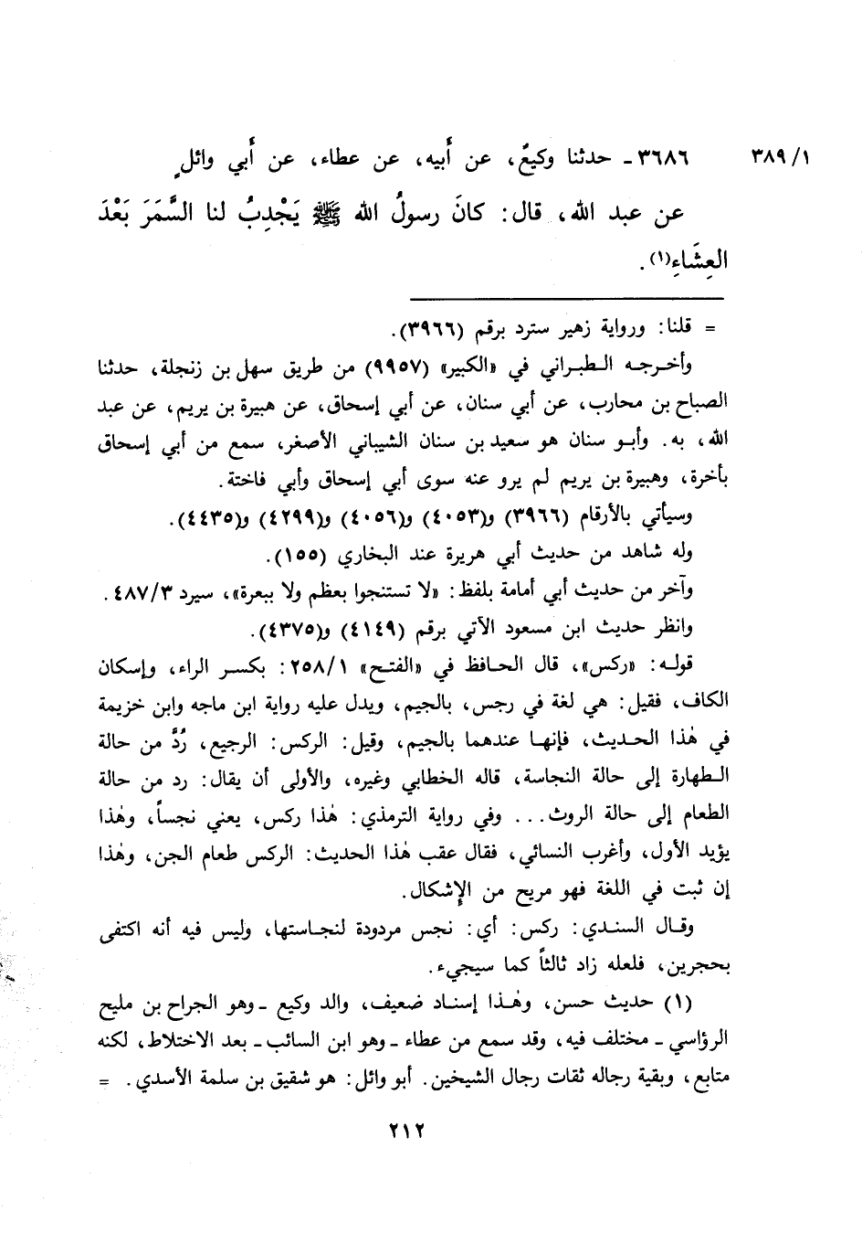 ٣٦٨٦ - حَدَّثَنَا وَكِيعٌ، عَنْ أَبِيهِ، عَنْ عَطَاءٍ، عَنْ أَبِي وَائِلٍ، عَنْ عَبْدِ اللهِ، قَالَ: " كَانَ رَسُولُ اللهِ صَلَّى اللهُ عَلَيْهِ وَسَلَّمَ يَجْدِبُ لَنَا السَّمَرَ بَعْدَ الْعِشَاءِ " (١)