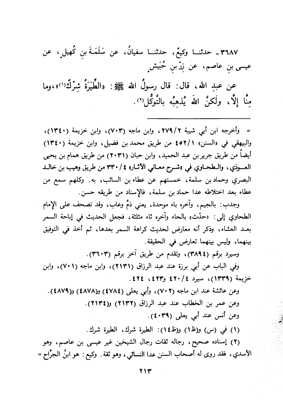 ٣٦٨٧ - حَدَّثَنَا وَكِيعٌ، حَدَّثَنَا سُفْيَانُ، عَنْ سَلَمَةَ بْنِ كُهَيْلٍ، عَنْ عِيسَى بْنِ عَاصِمٍ، عَنْ زِرِّ بْنِ حُبَيْشٍ، عَنْ عَبْدِ اللهِ، قَالَ: قَالَ رَسُولُ اللهِ صَلَّى اللهُ عَلَيْهِ وَسَلَّمَ: " الطِّيَرَةُ شِرْكٌ (١) "، وَمَا مِنَّا إِلَّا، وَلَكِنَّ اللهَ يُذْهِبُهُ بِالتَّوَكُّلِ (٢)