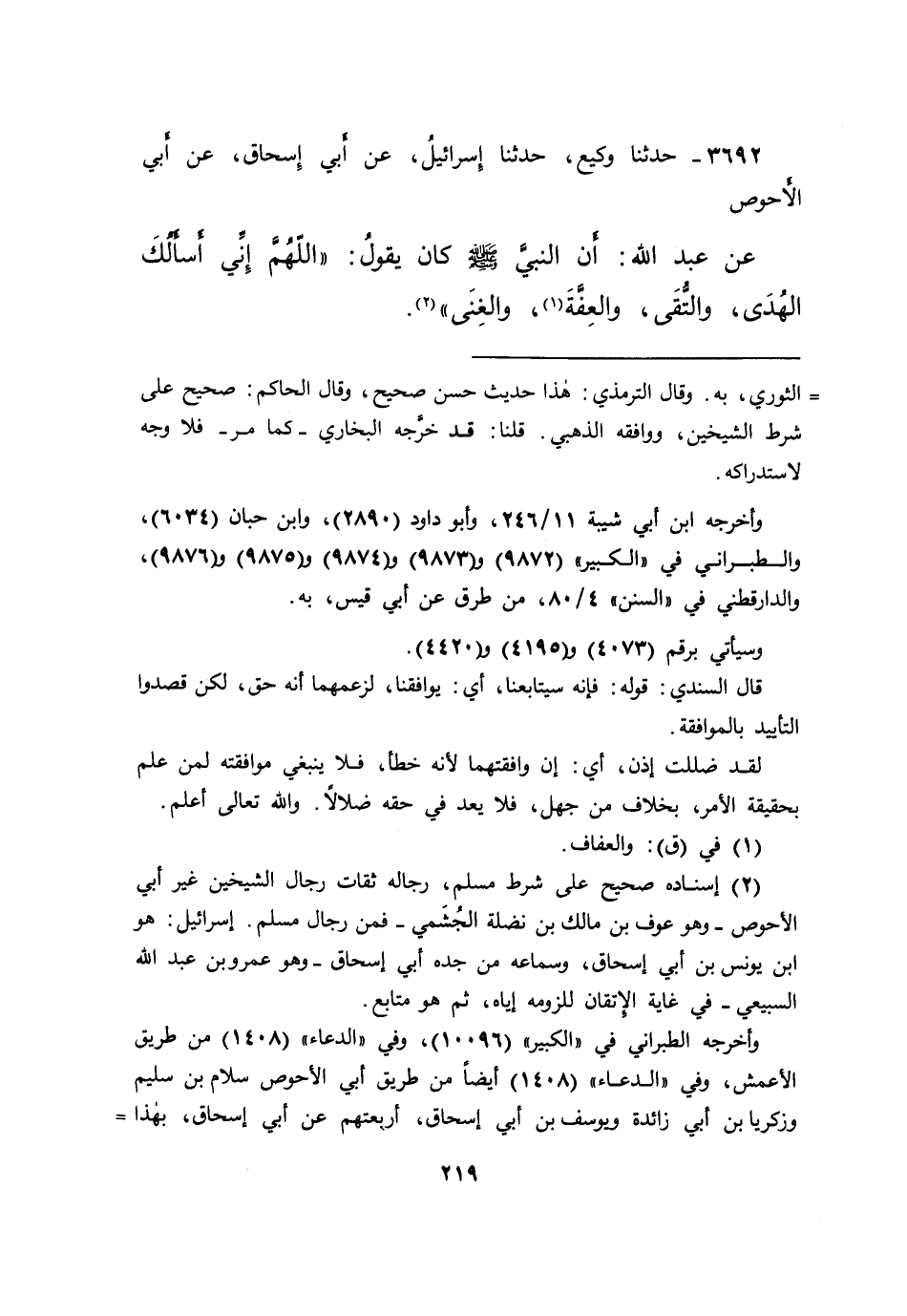 ٣٦٩٢ - حَدَّثَنَا وَكِيعٌ، حَدَّثَنَا إِسْرَائِيلُ، عَنْ أَبِي إِسْحَاقَ، عَنْ أَبِي الْأَحْوَصِ، عَنْ عَبْدِ اللهِ: أَنَّ النَّبِيَّ صَلَّى اللهُ عَلَيْهِ وَسَلَّمَ كَانَ يَقُولُ: " اللهُمَّ إِنِّي أَسْأَلُكَ الْهُدَى، وَالتُّقَى، وَالْعِفَّةَ (١) ، وَالْغِنَى " (٢)