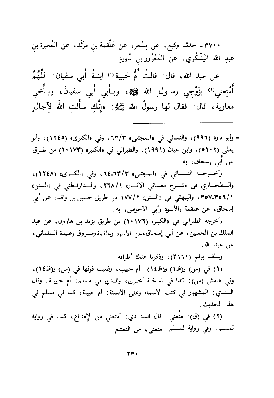 ٣٧٠٠ - حَدَّثَنَا وَكِيعٌ، عَنْ مِسْعَرٍ، عَنْ عَلْقَمَةَ بْنِ مَرْثَدٍ، عَنْ الْمُغِيرَةِ بْنِ عَبْدِ اللهِ الْيَشْكُرِيِّ، عَنْ الْمَعْرُورِ بْنِ سُوَيْدٍ، عَنْ عَبْدِ اللهِ، قَالَ: قَالَتْ أُمُّ حَبِيبَةَ (١) ابْنَةُ أَبِي سُفْيَانَ: اللهُمَّ أَمْتِعْنِي (٢) بِزَوْجِي رَسُولِ اللهِ صَلَّى اللهُ عَلَيْهِ وَسَلَّمَ، وَبِأَبِي أَبِي سُفْيَانَ، وَبِأَخِي مُعَاوِيَةَ، قَالَ: فَقَالَ لَهَا رَسُولُ اللهِ صَلَّى اللهُ عَلَيْهِ وَسَلَّمَ: " إِنَّكِ سَأَلْتِ اللهَ لِآجَالٍ
