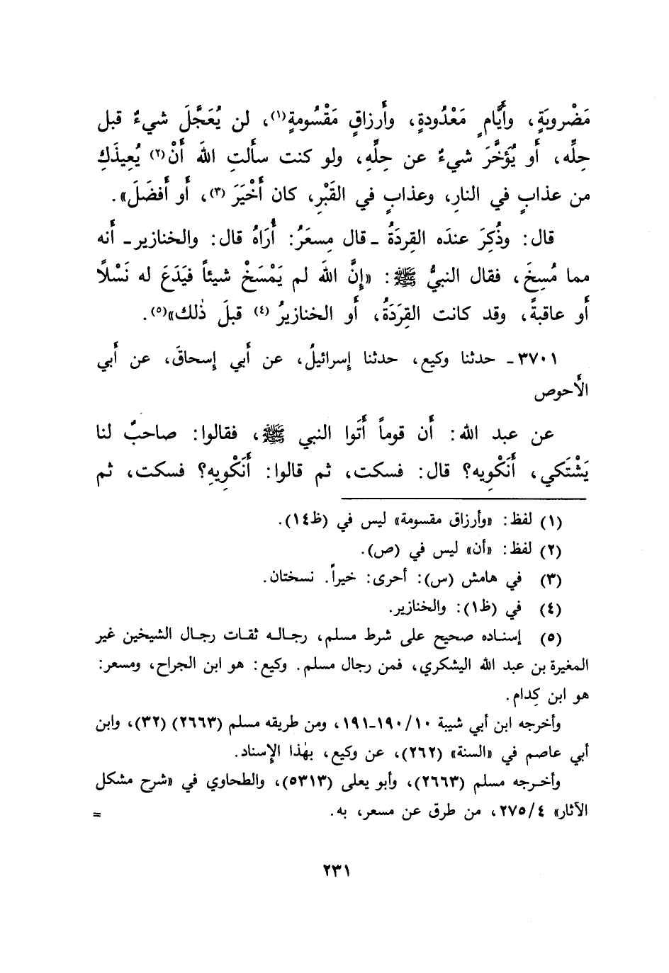 قَالَ: وَذُكِرَ عِنْدَهُ الْقِرَدَةُ - قَالَ مِسْعَرٌ: أُرَاهُ قَالَ: وَالْخَنَازِيرُ - إِنَّهُ مِمَّا مُسِخَ، فَقَالَ النَّبِيُّ صَلَّى اللهُ عَلَيْهِ وَسَلَّمَ: " إِنَّ اللهَ لَمْ يَمْسَخْ شَيْئًا فَيَدَعَ لَهُ نَسْلًا، أَوْ عَاقِبَةً، وَقَدْ كَانَتِ الْقِرَدَةُ، أَوِ الْخَنَازِيرُ (٤) قَبْلَ ذَلِكَ " (٥)
