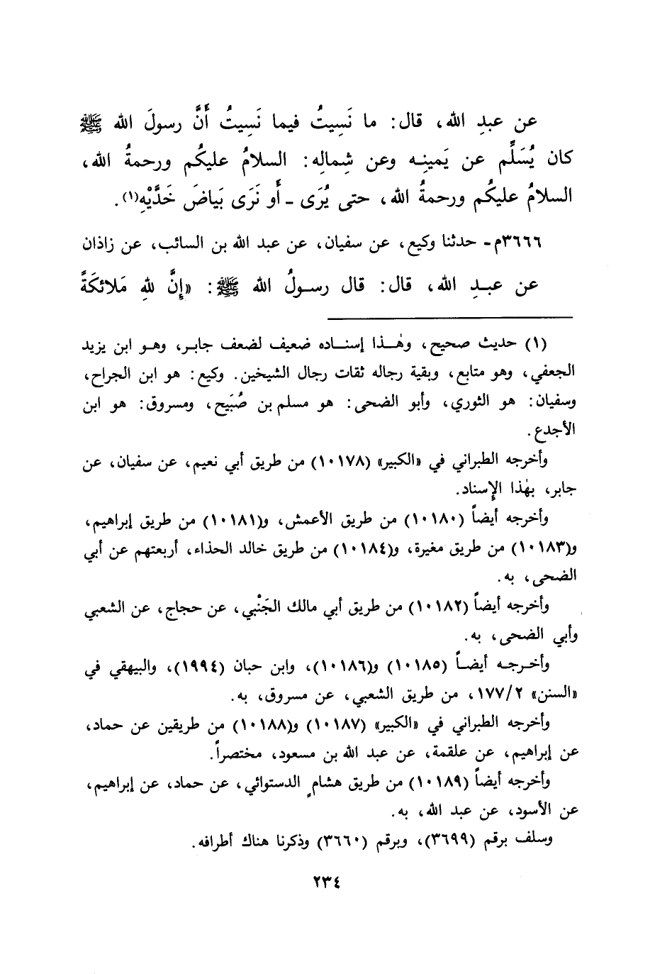 عَنْ عَبْدِ اللهِ، قَالَ: مَا نَسِيتُ فِيمَا نَسِيتُ أَنَّ رَسُولَ اللهِ صَلَّى اللهُ عَلَيْهِ وَسَلَّمَ " كَانَ يُسَلِّمُ عَنْ يَمِينِهِ وَعَنْ شِمَالِهِ: السَّلَامُ عَلَيْكُمْ وَرَحْمَةُ اللهِ، السَّلَامُ عَلَيْكُمْ وَرَحْمَةُ اللهِ، حَتَّى يُرَى أَوْ نَرَى بَيَاضَ خَدَّيْهِ " (١)