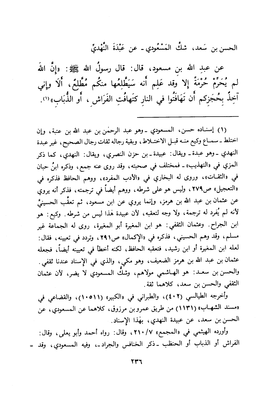 الْحَسَنِ بْنِ سَعْدٍ - شَكَّ الْمَسْعُودِيُّ - عَنِ عَبْدَةَ النَّهْدِيِّ، عَنْ عَبْدِ اللهِ بْنِ مَسْعُودٍ، قَالَ: قَالَ رَسُولُ اللهِ صَلَّى اللهُ عَلَيْهِ وَسَلَّمَ: " إِنَّ اللهَ لَمْ يُحَرِّمْ حُرْمَةً إِلَّا وَقَدْ عَلِمَ أَنَّهُ سَيَطَّلِعُهَا مِنْكُمْ مُطَّلِعٌ، أَلَا وَإِنِّي آخِذٌ بِحُجَزِكُمْ أَنْ تَهَافَتُوا فِي النَّارِ كَتَهَافُتِ الْفَرَاشِ، أَوِ الذُّبَابِ " (١)