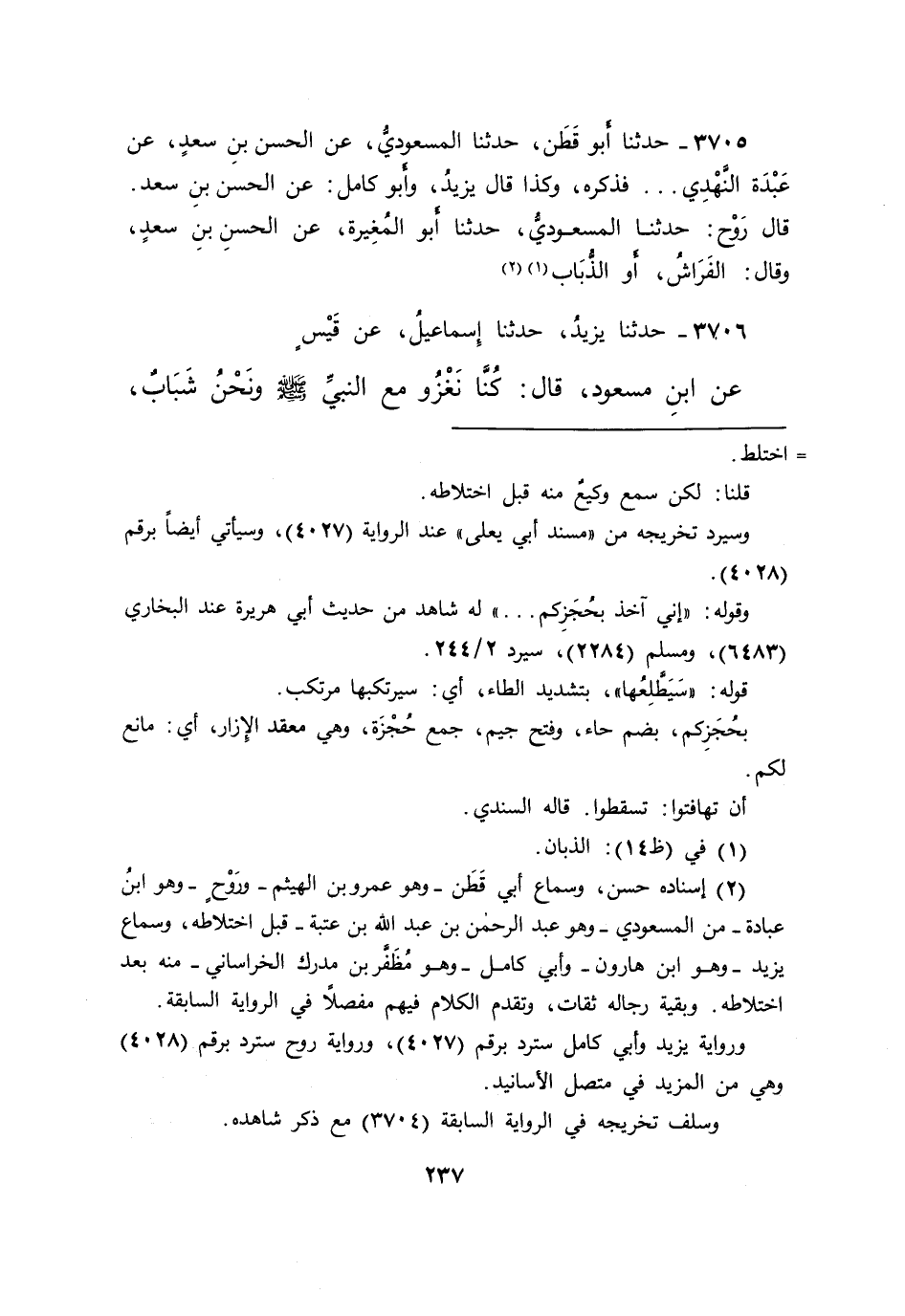 ٣٧٠٥ - حَدَّثَنَا أَبُو قَطَنٍ، حَدَّثَنَا الْمَسْعُودِيُّ، عَنِ الْحَسَنِ بْنِ سَعْدٍ، عَنْ عَبْدَةَ النَّهْدِيِّ، فَذَكَرَهُ، وَكَذَا قَالَ يَزِيدُ، وَأَبَو كَامِلٍ: عَنِ الْحَسَنِ بْنِ سَعْدٍ، قَالَ رَوْحٌ: حَدَّثَنَا الْمَسْعُودِيُّ، حَدَّثَنَا أَبُو الْمُغِيرَةِ، عَنِ الْحَسَنِ بْنِ سَعْدٍ، وَقَالَ: " الْفَرَاشِ، أَوِ الذُّبَابِ " (١) (٢)