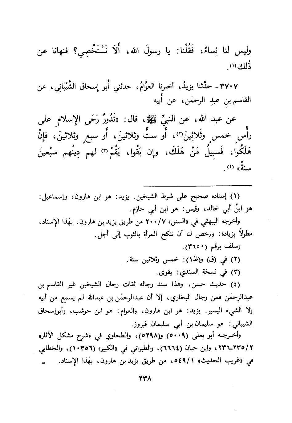 ٣٧٠٧ - حَدَّثَنَا يَزِيدُ، أَخْبَرَنَا الْعَوَّامُ، حَدَّثَنِي أَبُو إِسْحَاقَ الشَّيْبَانِيُّ، عَنِ الْقَاسِمِ بْنِ عَبْدِ الرَّحْمَنِ، عَنْ أَبِيهِ، عَنْ عَبْدِ اللهِ، عَنِ النَّبِيِّ صَلَّى اللهُ عَلَيْهِ وَسَلَّمَ، قَالَ: " تَدُورُ رَحَى الْإِسْلَامِ عَلَى رَأْسِ خَمْسٍ وَثَلَاثِينَ، (٢) أَوْ سِتٍّ وَثَلَاثِينَ، أَوْ سَبْعٍ وَثَلَاثِينَ، فَإِنْ هَلَكُوا، فَسَبِيلُ مَنْ هَلَكَ، وَإِنْ بَقُوا، يَقُمْ (٣) لَهُمْ دِينُهُمْ سَبْعِينَ سَنَةً " (٤)
