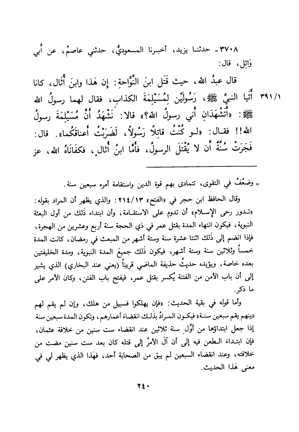 ٣٧٠٨ - حَدَّثَنَا يَزِيدُ، أَخْبَرَنَا الْمَسْعُودِيُّ، حَدَّثَنِي عَاصِمٌ، عَنْ أَبِي وَائِلٍ، قَالَ: قَالَ عَبْدُ اللهِ، حَيْثُ قُتِلَ ابْنُ النَّوَّاحَةِ: إِنَّ هَذَا وَابْنَ أُثَالٍ، كَانَا أَتَيَا النَّبِيَّ صَلَّى اللهُ عَلَيْهِ وَسَلَّمَ، رَسُولَيْنِ لِمُسَيْلِمَةَ الْكَذَّابِ، فَقَالَ لَهُمَا رَسُولُ اللهِ صَلَّى اللهُ عَلَيْهِ وَسَلَّمَ: " أَتَشْهَدَانِ أَنِّي رَسُولُ اللهِ؟ " قَالَا: نَشْهَدُ أَنَّ مُسَيْلِمَةَ رَسُولُ اللهِ فَقَالَ: " لَوْ كُنْتُ قَاتِلًا رَسُولًا، لَضَرَبْتُ أَعْنَاقَكُمَا " قَالَ: فَجَرَتْ سُنَّةً أَنْ لَا يُقْتَلَ الرَّسُولُ، فَأَمَّا ابْنُ أُثَالٍ، فَكَفَانَاهُ اللهُ عَزَّ