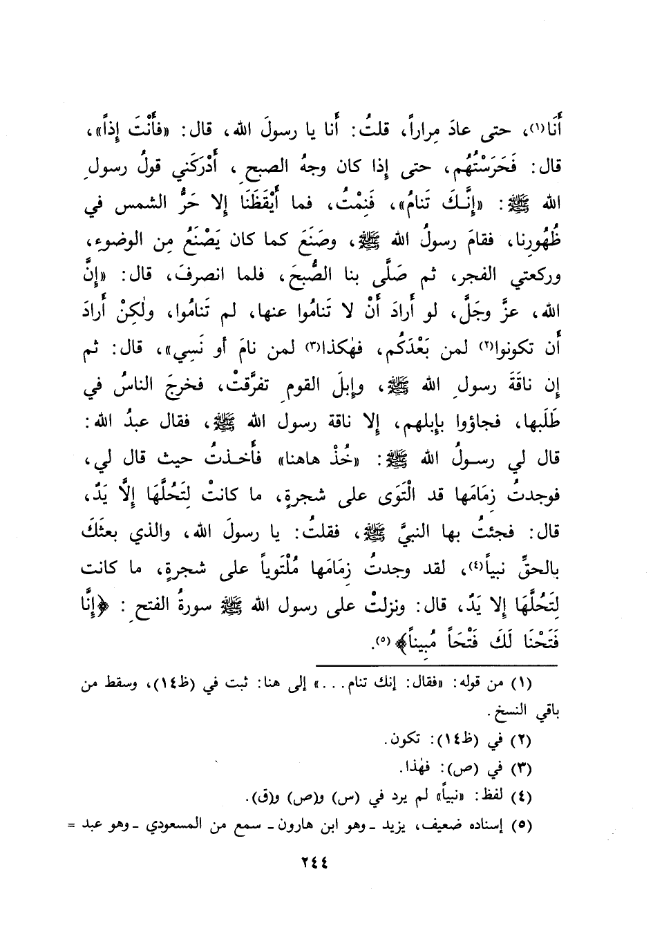 أَنَا (١) . حَتَّى عَادَ مِرَارًا، قُلْتُ: أَنَا يَا رَسُولَ اللهِ، قَالَ: " فَأَنْتَ إِذًا "، قَالَ: فَحَرَسْتُهُمْ، حَتَّى إِذَا كَانَ وَجْهُ الصُّبْحِ، أَدْرَكَنِي قَوْلُ رَسُولِ اللهِ صَلَّى اللهُ عَلَيْهِ وَسَلَّمَ: " إِنَّكَ تَنَامُ "، فَنِمْتُ، فَمَا أَيْقَظَنَا إِلَّا حَرُّ الشَّمْسِ فِي ظُهُورِنَا، فَقَامَ رَسُولُ اللهِ صَلَّى اللهُ عَلَيْهِ وَسَلَّمَ، وَصَنَعَ كَمَا كَانَ يَصْنَعُ مِنَ الْوُضُوءِ، وَرَكْعَتَيِ الْفَجْرِ، ثُمَّ صَلَّى بِنَا الصُّبْحَ، فَلَمَّا انْصَرَفَ، قَالَ: " إِنَّ اللهَ عَزَّ وَجَلَّ، لَوْ أَرَادَ أَنْ لَا تَنَامُوا عَنْهَا، لَمْ تَنَامُوا، وَلَكِنْ أَرَادَ أَنْ تَكُونُوا (٢) لِمَنْ بَعْدَكُمْ، فَهَكَذَا (٣) لِمَنْ نَامَ أَوْ نَسِيَ "، قَالَ: ثُمَّ إِنَّ نَاقَةَ رَسُولِ اللهِ صَلَّى اللهُ عَلَيْهِ وَسَلَّمَ، وَإِبِلَ الْقَوْمِ تَفَرَّقَتْ، فَخَرَجَ النَّاسُ فِي طَلَبِهَا، فَجَاءُوا بِإِبِلِهِمْ، إِلَّا نَاقَةَ رَسُولِ اللهِ صَلَّى اللهُ عَلَيْهِ وَسَلَّمَ، فَقَالَ عَبْدُ اللهِ: قَالَ لِي رَسُولُ اللهِ صَلَّى اللهُ عَلَيْهِ وَسَلَّمَ: " خُذْ هَاهُنَا " فَأَخَذْتُ حَيْثُ قَالَ لِي، فَوَجَدْتُ زِمَامَهَا قَدِ الْتَوَى عَلَى شَجَرَةٍ، مَا كَانَتْ لِتَحُلَّهَا إِلَّا يَدٌ، قَالَ: فَجِئْتُ بِهَا النَّبِيَّ صَلَّى اللهُ عَلَيْهِ وَسَلَّمَ، فَقُلْتُ: يَا رَسُولَ اللهِ، وَالَّذِي بَعَثَكَ بِالْحَقِّ نَبِيًّا (٤) ، لَقَدْ وَجَدْتُ زِمَامَهَا مُلْتَوِيًا عَلَى شَجَرَةٍ، مَا كَانَتْ لِتَحُلَّهَا إِلَّا يَدٌ، قَالَ: وَنَزَلَتْ عَلَى رَسُولِ اللهِ صَلَّى اللهُ عَلَيْهِ وَسَلَّمَ سُورَةُ الْفَتْحِ: {إِنَّا فَتَحْنَا لَكَ فَتْحًا مُبِينًا} (٥) [الفتح: ١]