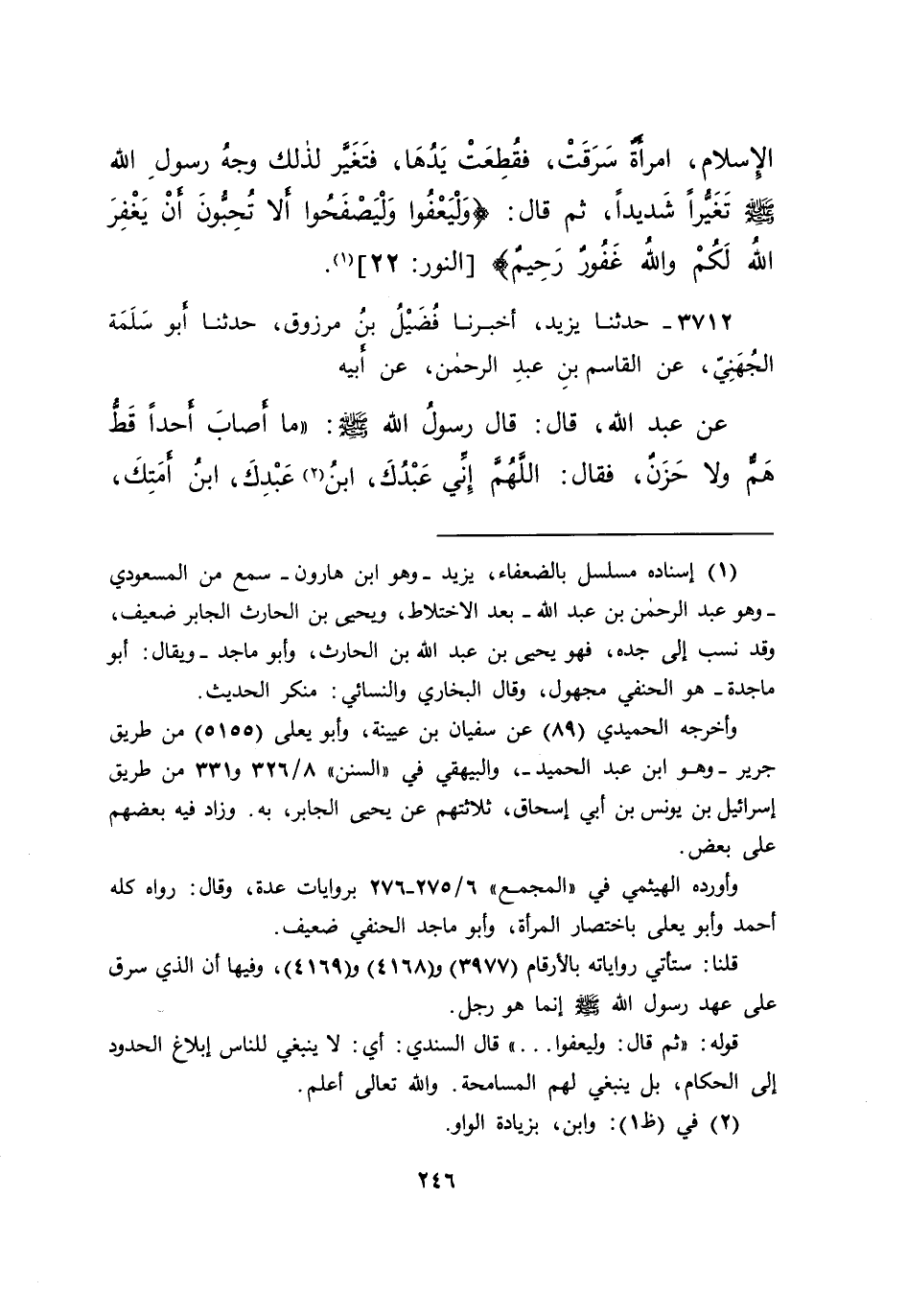 ٣٧١٢ - حَدَّثَنَا يَزِيدُ، أَخْبَرَنَا فُضَيْلُ بْنُ مَرْزُوقٍ، حَدَّثَنَا أَبُو سَلَمَةَ الْجُهَنِيُّ، عَنِ الْقَاسِمِ بْنِ عَبْدِ الرَّحْمَنِ، عَنْ أَبِيهِ، عَنْ عَبْدِ اللهِ، قَالَ: قَالَ رَسُولُ اللهِ صَلَّى اللهُ عَلَيْهِ وَسَلَّمَ: " مَا أَصَابَ أَحَدًا قَطُّ هَمٌّ وَلَا حَزَنٌ، فَقَالَ: اللهُمَّ إِنِّي عَبْدُكَ، ابْنُ (٢) عَبْدِكَ، ابْنُ أَمَتِكَ،