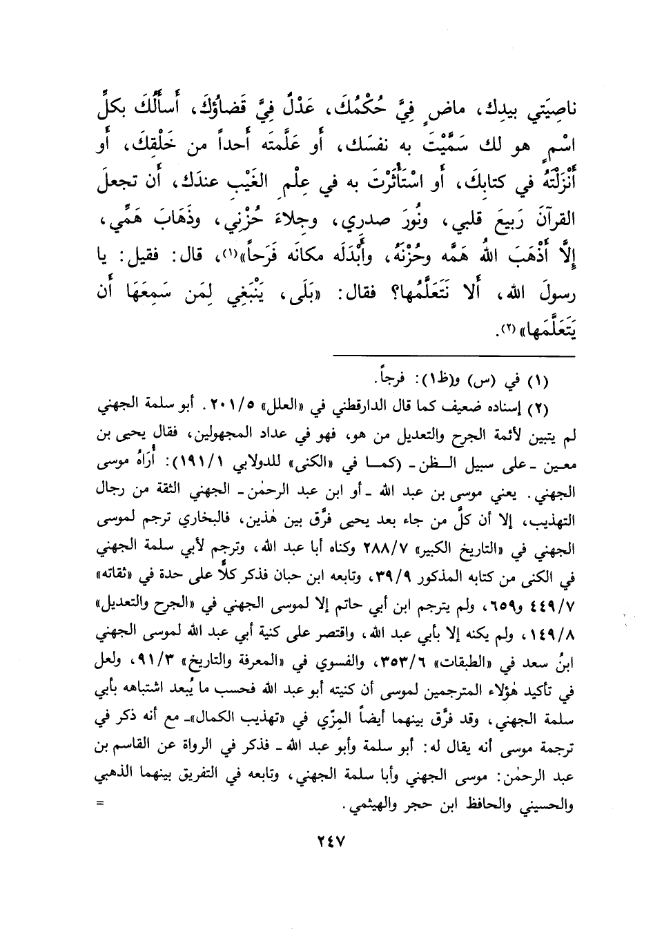 نَاصِيَتِي بِيَدِكَ، مَاضٍ فِيَّ حُكْمُكَ، عَدْلٌ فِيَّ قَضَاؤُكَ، أَسْأَلُكَ بِكُلِّ اسْمٍ هُوَ لَكَ سَمَّيْتَ بِهِ نَفْسَكَ، أَوْ عَلَّمْتَهُ أَحَدًا مِنْ خَلْقِكَ، أَوْ أَنْزَلْتَهُ فِي كِتَابِكَ، أَوِ اسْتَأْثَرْتَ بِهِ فِي عِلْمِ الْغَيْبِ عِنْدَكَ، أَنْ تَجْعَلَ الْقُرْآنَ رَبِيعَ قَلْبِي، وَنُورَ صَدْرِي، وَجِلَاءَ حُزْنِي، وَذَهَابَ هَمِّي، إِلَّا أَذْهَبَ اللهُ هَمَّهُ وَحُزْنَهُ، وَأَبْدَلَهُ مَكَانَهُ فَرَحًا " (١) ، قَالَ: فَقِيلَ: يَا رَسُولَ اللهِ، أَلَا نَتَعَلَّمُهَا؟ فَقَالَ: " بَلَى، يَنْبَغِي لِمَنْ سَمِعَهَا أَنْ يَتَعَلَّمَهَا " (٢)