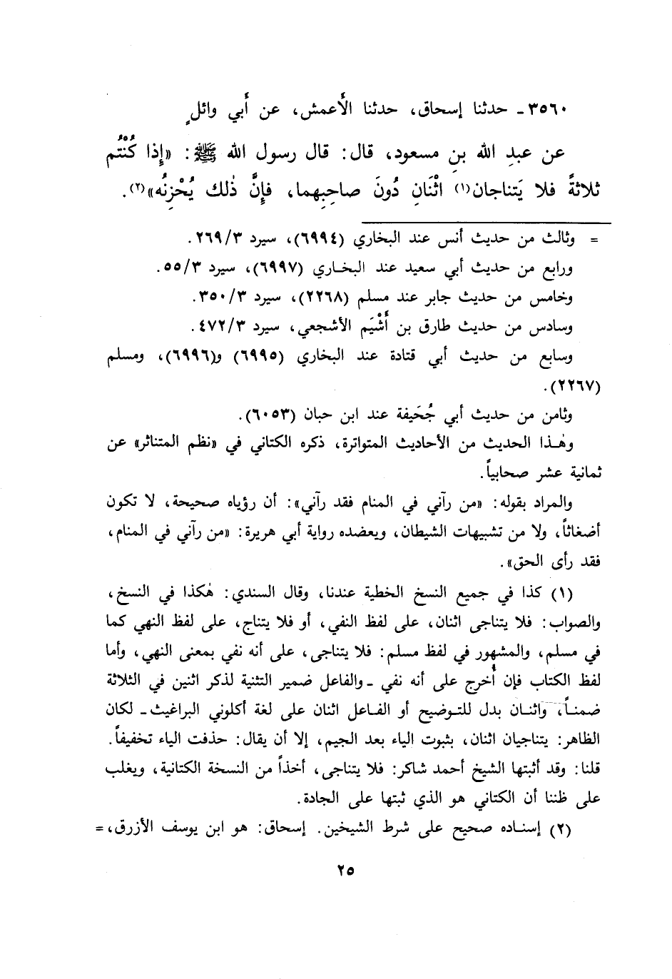 ٣٥٦٠ - حَدَّثَنَا إِسْحَاقُ، حَدَّثَنَا الْأَعْمَشُ، عَنْ أَبِي وَائِلٍ، عَنْ عَبْدِ اللهِ بْنِ مَسْعُودٍ، قَالَ: قَالَ رَسُولُ اللهِ صَلَّى اللهُ عَلَيْهِ وَسَلَّمَ: " إِذَا كُنْتُمْ ثَلَاثَةً فَلَا يَتَنَاجَان (١) اثْنَانِ دُونَ صَاحِبِهِمَا، فَإِنَّ ذَلِكَ يَحْزُنُهُ " (٢)