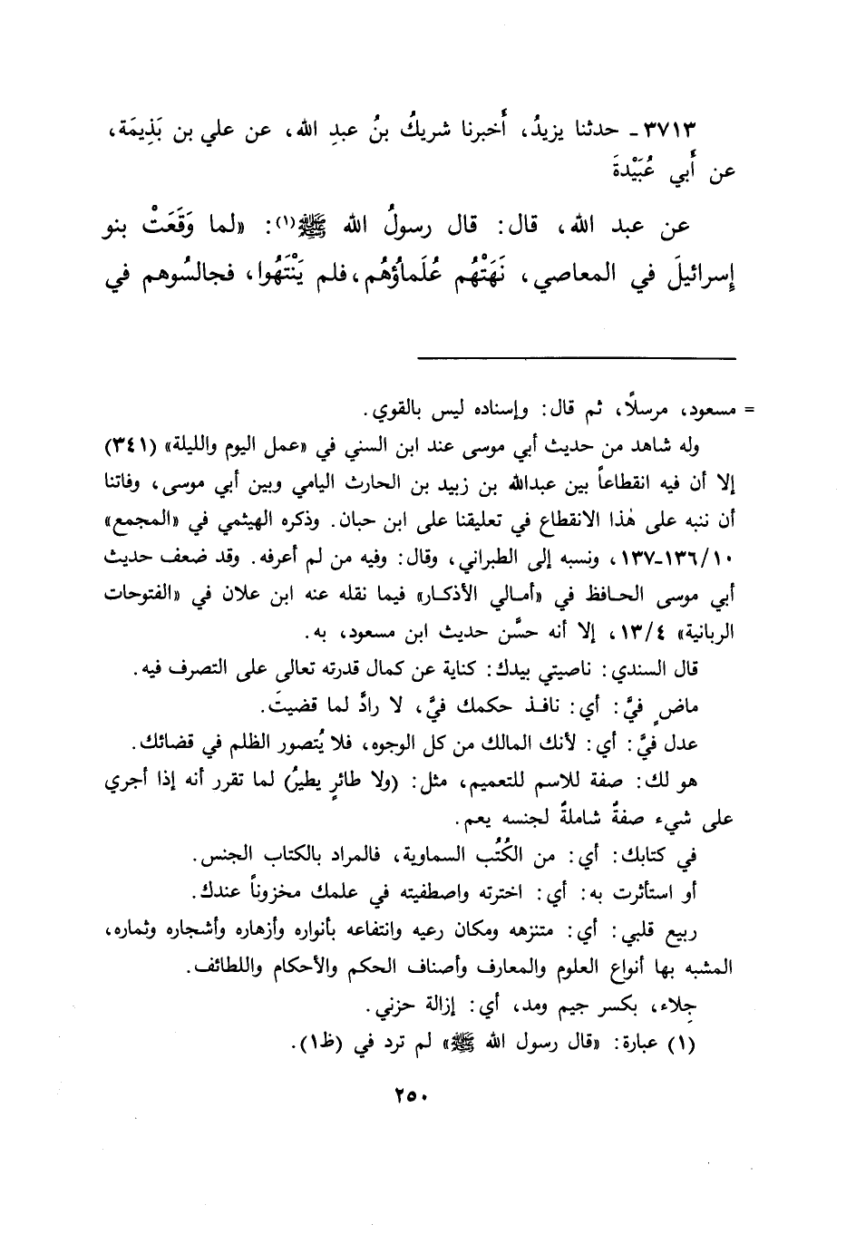 ٣٧١٣ - حَدَّثَنَا يَزِيدُ، أَخْبَرَنَا شَرِيكُ بْنُ عَبْدِ اللهِ، عَنْ عَلِيِّ بْنِ بَذِيمَةَ، عَنْ أَبِي عُبَيْدَةَ، عَنْ عَبْدِ اللهِ، قَالَ: قَالَ رَسُولُ اللهِ صَلَّى اللهُ عَلَيْهِ وَسَلَّمَ (١) : " لَمَّا وَقَعَتْ بَنُو إِسْرَائِيلَ فِي الْمَعَاصِي، نَهَتْهُمْ عُلَمَاؤُهُمْ، فَلَمْ يَنْتَهُوا، فَجَالَسُوهُمْ فِي