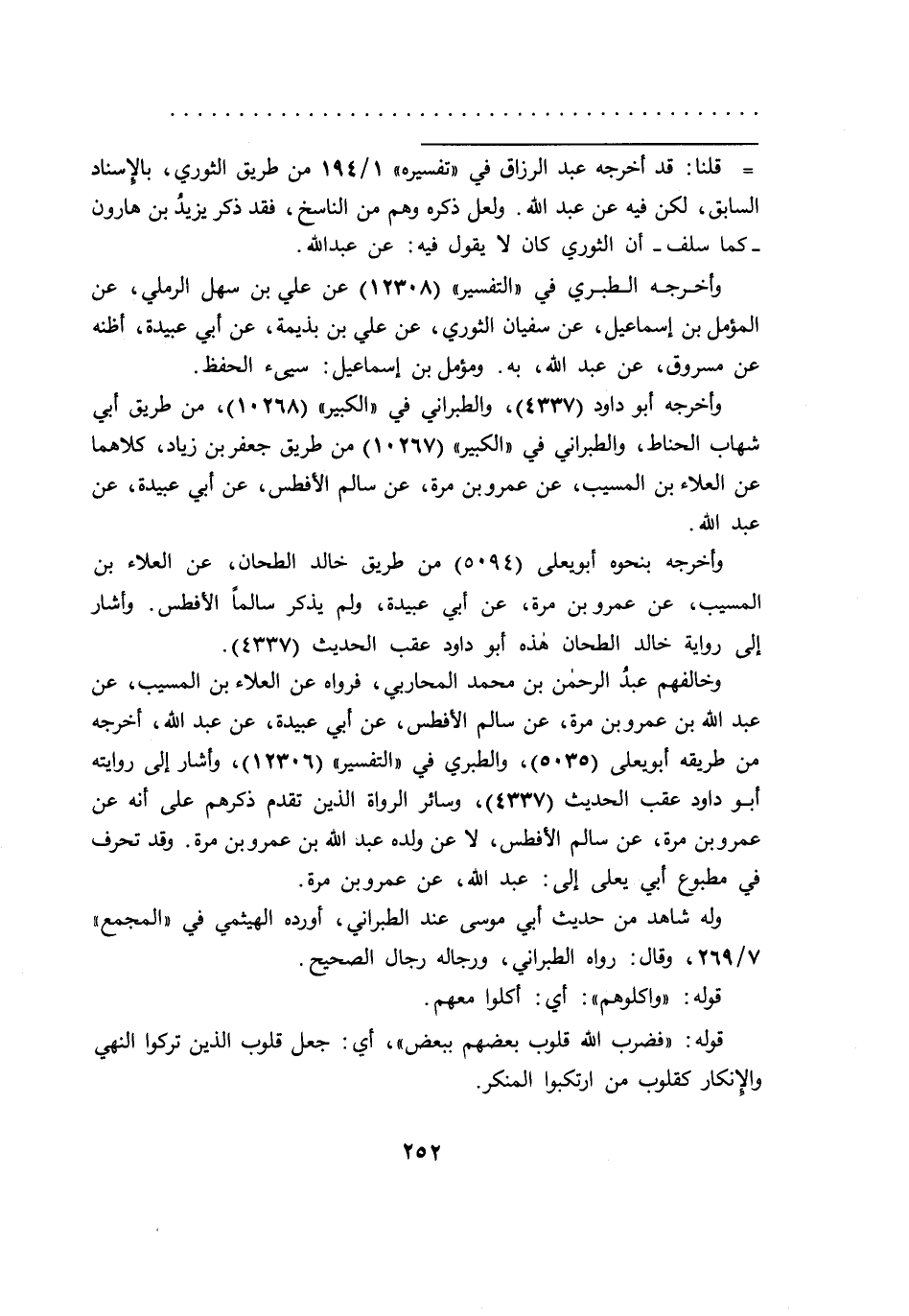 وخالفهم عبد الرحمن بن محمد المحاربي، فرواه عن العلاء بن المسيب، عن عبد الله بن عمرو بن مرة، عن سالم الأفطس، عن أبي عبيدة، عن عبد الله، أخرجه من طريقه أبو يعلى (٥٠٣٥) ، والطبري في "التفسير" (١٢٣٠٦) ، وأشار إلى روايته أبو داود عقب الحديث (٤٣٣٧) ، وسائر الرواة الذين تقدم ذكرهم على أنه عن عمرو بن مرة، عن سالم الأفطس، لا عن ولده عبد الله بن عمرو بن مرة. وقد تحرف في مطبوع أبي يعلى إلى: عبد الله، عن عمرو بن مرة.