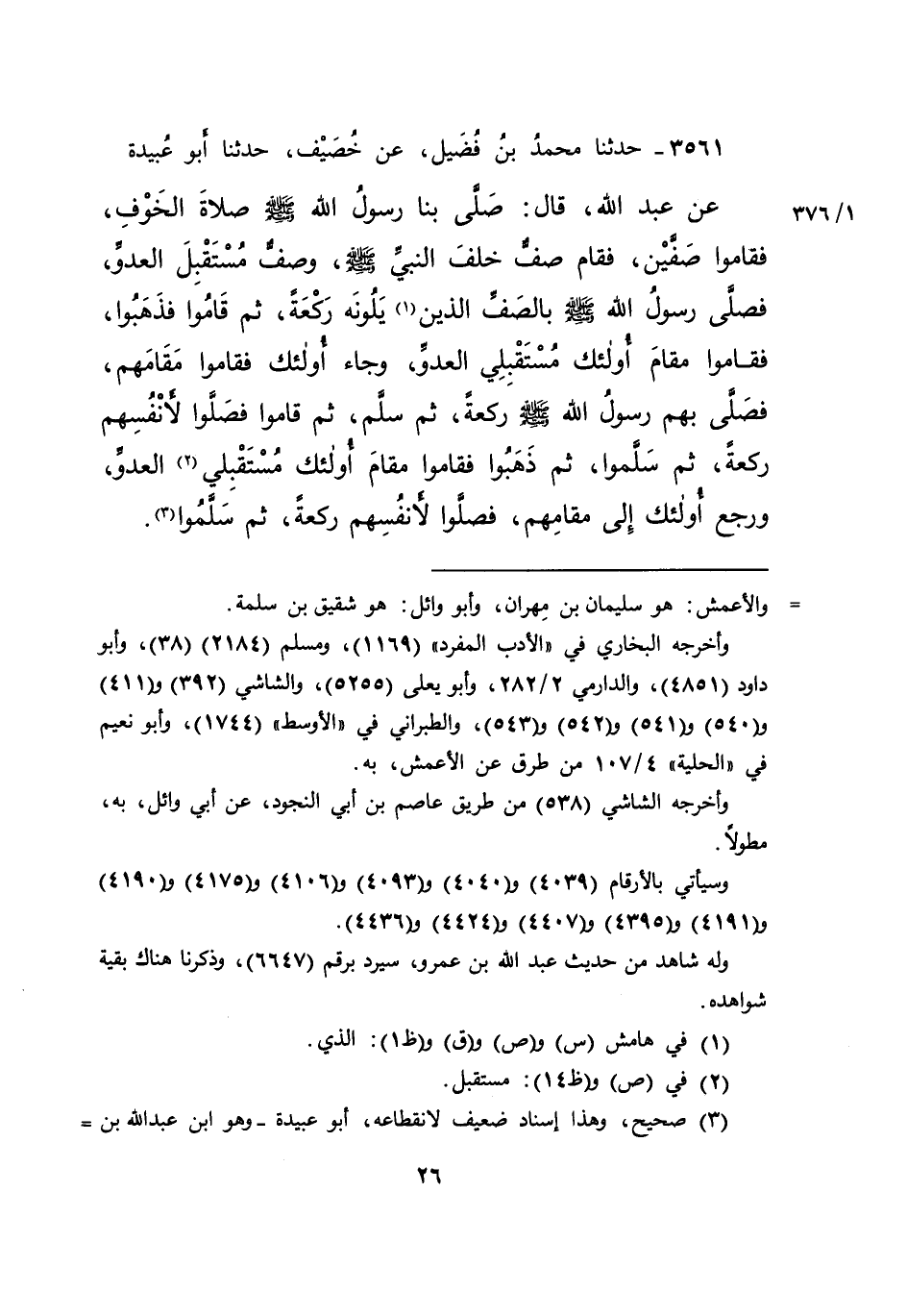 ٣٥٦١ - حَدَّثَنَا مُحَمَّدُ بْنُ فُضَيْلٍ، عَنْ خُصَيْفٍ، حَدَّثَنَا أَبُو عُبَيْدَةَ، عَنْ عَبْدِ اللهِ، قَالَ: " صَلَّى بِنَا رَسُولُ اللهِ صَلَّى اللهُ عَلَيْهِ وَسَلَّمَ صَلَاةَ الْخَوْفِ، فَقَامُوا صَفَّيْنِ، فَقَامَ صَفٌّ خَلْفَ النَّبِيِّ صَلَّى اللهُ عَلَيْهِ وَسَلَّمَ، وَصَفٌّ مُسْتَقْبِلَ الْعَدُوِّ، فَصَلَّى رَسُولُ اللهِ صَلَّى اللهُ عَلَيْهِ وَسَلَّمَ بِالصَّفِّ الَّذِينَ (١) يَلُونَهُ رَكْعَةً، ثُمَّ قَامُوا فَذَهَبُوا، فَقَامُوا مَقَامَ أُولَئِكَ مُسْتَقْبِلِي الْعَدُوِّ، وَجَاءَ أُولَئِكَ فَقَامُوا مَقَامَهُمْ، فَصَلَّى بِهِمْ رَسُولُ اللهِ صَلَّى اللهُ عَلَيْهِ وَسَلَّمَ رَكْعَةً، ثُمَّ سَلَّمَ، ثُمَّ قَامُوا فَصَلَّوْا لِأَنْفُسِهِمْ رَكْعَةً، ثُمَّ سَلَّمُوا، ثُمَّ ذَهَبُوا فَقَامُوا مَقَامَ أُولَئِكَ مُسْتَقْبِلِي (٢) الْعَدُوِّ، وَرَجَعَ أُولَئِكَ إِلَى مَقَامِهِمْ، فَصَلَّوْا لِأَنْفُسِهِمْ رَكْعَةً، ثُمَّ سَلَّمُوا " (٣)