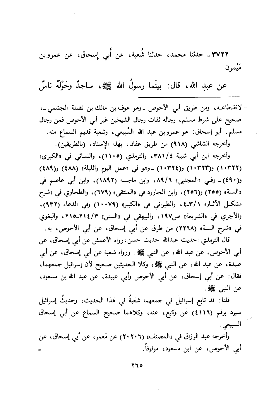 قال الترمذي: حديث عبد الله حديث حسن، رواه الأعمش عن أبي إسحاق، عن أبي الأحوص، عن عبد الله، عن النبي صَلَّى اللهُ عَلَيْهِ وَسَلَّمَ. ورواه شعبة عن أبي إسحاق، عن أبي عبيدة، عن عبد الله، عن النبي صَلَّى اللهُ عَلَيْهِ وَسَلَّمَ، وكلا الحديثين صحيح لأن إسرائيل جمعهما، فقال: عن أبي إسحاق، عن أبي الأحوص وأبي عبيدة، عن عبد الله بن مسعود، عن النبي صَلَّى اللهُ عَلَيْهِ وَسَلَّمَ.