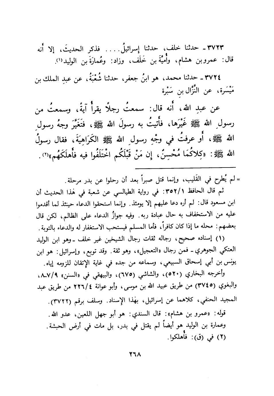 ٣٧٢٤ - حَدَّثَنَا مُحَمَّدٌ هُوَ ابْنُ جَعْفَرٍ، حَدَّثَنَا شُعْبَةُ، عَنْ عَبْدِ الْمَلِكِ بْنِ مَيْسَرَةَ، عَنِ النَّزَّالِ بْنِ سَبْرَةَ، عَنْ عَبْدِ اللهِ، أَنَّهُ قَالَ: سَمِعْتُ رَجُلًا يَقْرَأُ آيَةً، وَسَمِعْتُ مِنْ رَسُولِ اللهِ صَلَّى اللهُ عَلَيْهِ وَسَلَّمَ غَيْرَهَا، فَأَتَيْتُ بِهِ رَسُولَ اللهِ صَلَّى اللهُ عَلَيْهِ وَسَلَّمَ، فَتَغَيَّرَ وَجْهُ رَسُولِ اللهِ صَلَّى اللهُ عَلَيْهِ وَسَلَّمَ، أَوْ عَرَفْتُ فِي وَجْهِ رَسُولِ اللهِ صَلَّى اللهُ عَلَيْهِ وَسَلَّمَ الْكَرَاهِيَةَ، فَقَالَ رَسُولُ اللهِ صَلَّى اللهُ عَلَيْهِ وَسَلَّمَ: " كِلَاكُمَا مُحْسِنٌ، إِنَّ مَنْ قَبْلَكُمِ اخْتَلَفُوا فِيهِ فَأَهْلَكَهُمْ " (٢)