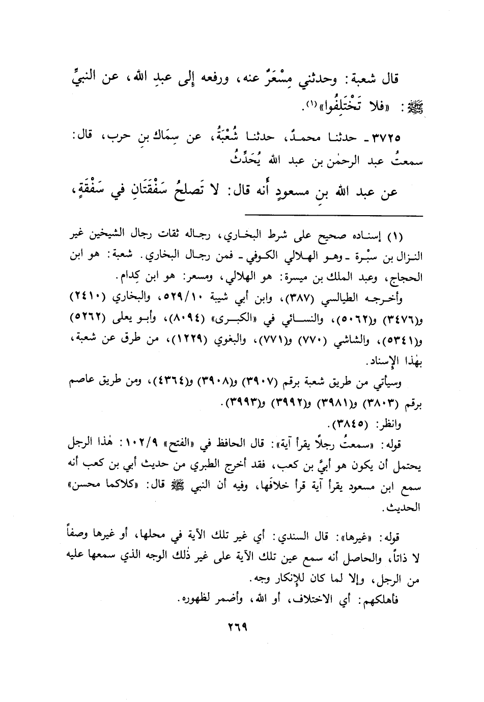 قَالَ شُعْبَةُ: وَحَدَّثَنِي مِسْعَرٌ، عَنْهُ، وَرَفَعَهُ إِلَى عَبْدِ اللهِ، عَنِ النَّبِيِّ صَلَّى اللهُ عَلَيْهِ وَسَلَّمَ: " فَلَا تَخْتَلِفُوا " (١)