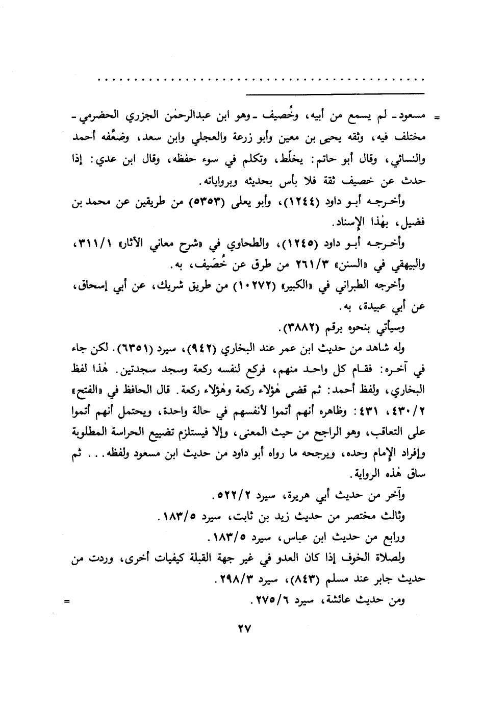 = مسعود- لم يسمع من أبيه، وخصيف -وهو ابن عبد الرحمن الجزري الحضرمي- مختلف فيه، وثقه يحيى بن معين وأبو زرعة والعجلي وابن سعد، وضعفه أحمد والنسائي، وقال أبو حاتم: يخلط، وتكلم في سوء حفظه، وقال ابن عدي: إذا حدث عن خصيف ثقة فلا بأس بحديثه وبرواياته.