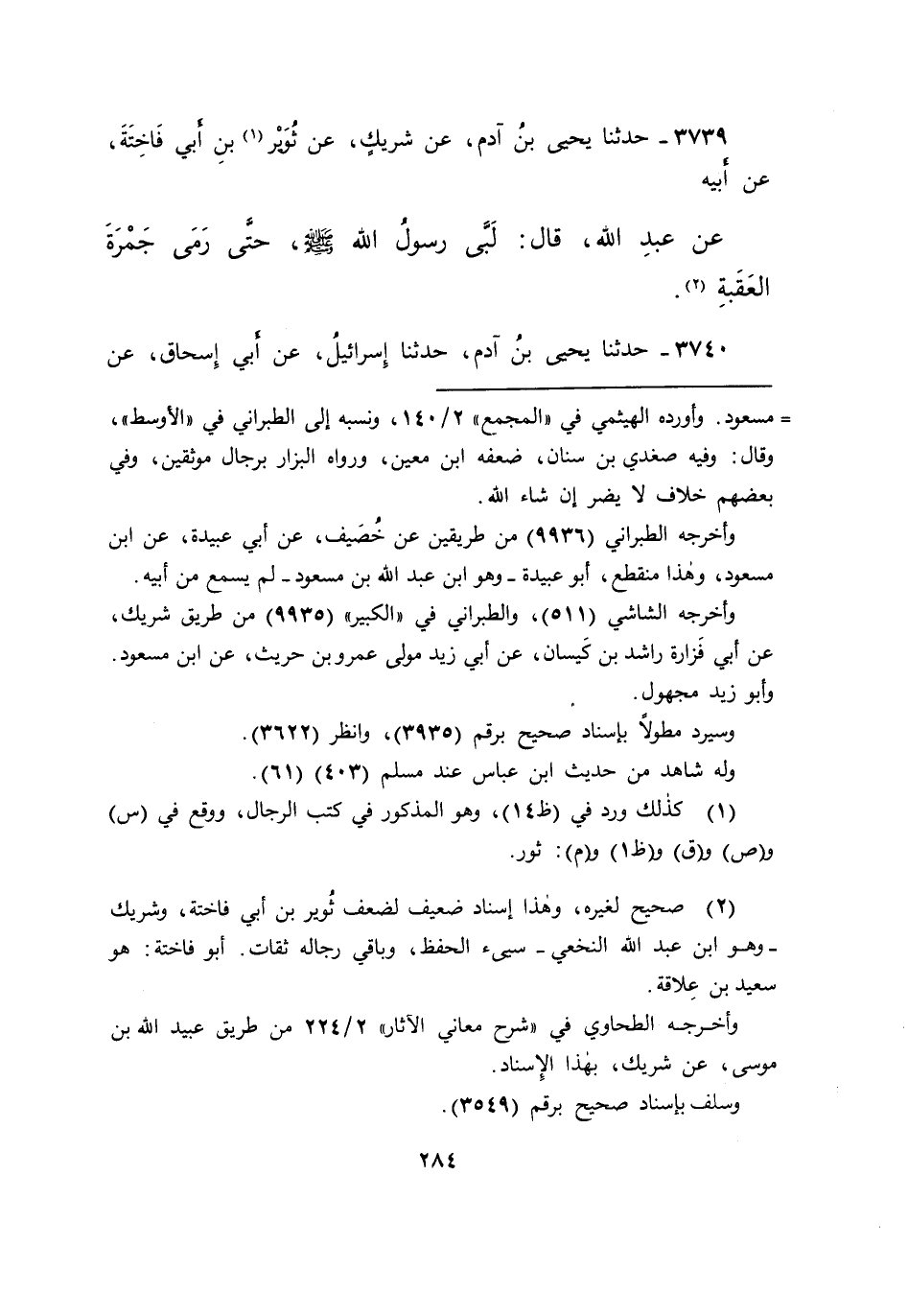 ٣٧٣٩ - حَدَّثَنَا يَحْيَى بْنُ آدَمَ، عَنْ شَرِيكٍ، عَنْ ثُوَيْرِ (١) بْنِ أَبِي فَاخِتَةَ، عَنْ أَبِيهِ، عَنْ عَبْدِ اللهِ، قَالَ: " لَبَّى رَسُولُ اللهِ صَلَّى اللهُ عَلَيْهِ وَسَلَّمَ، حَتَّى رَمَى جَمْرَةَ الْعَقَبَةِ " (٢)