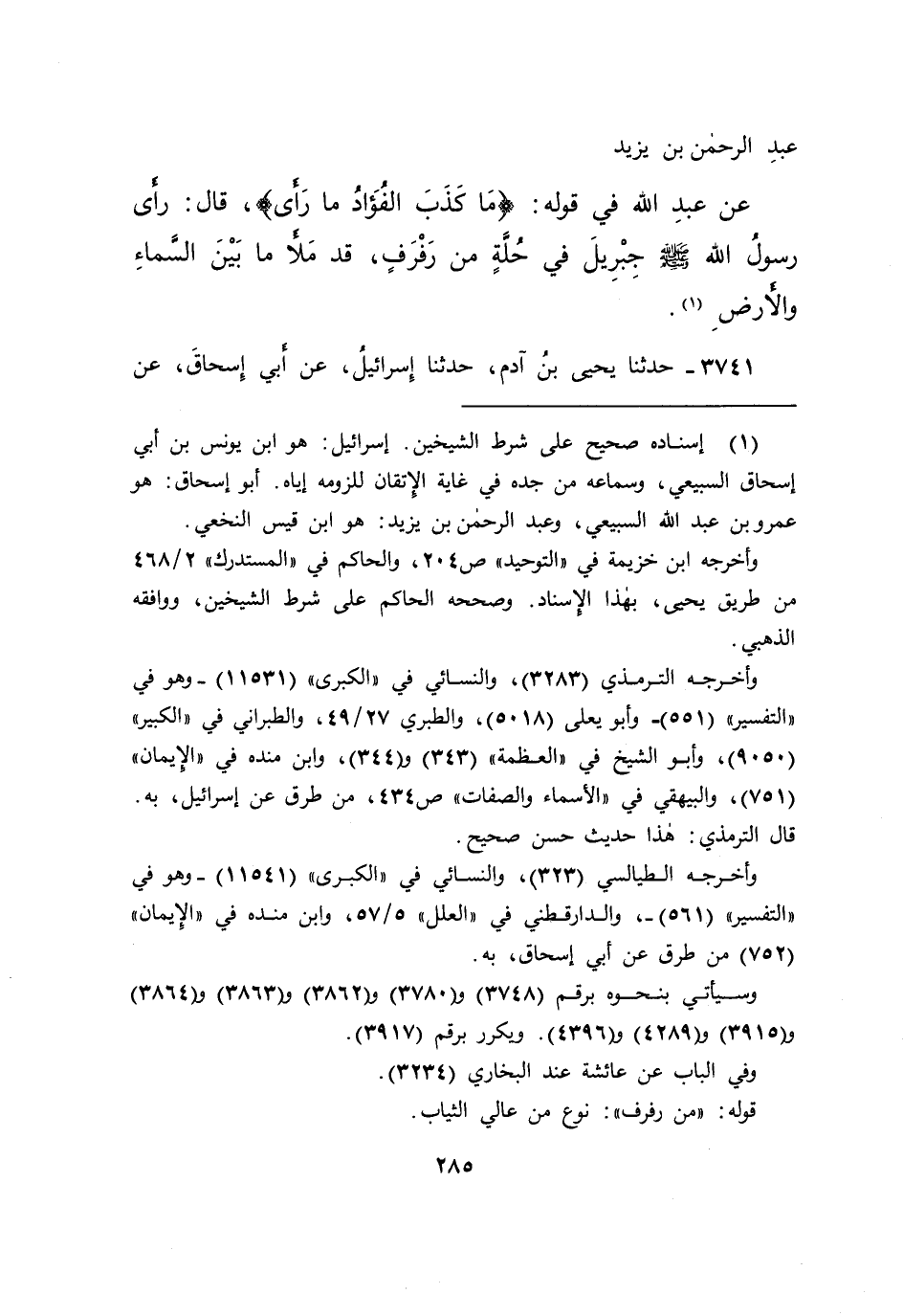 عَبْدِ الرَّحْمَنِ بْنِ يَزِيدَ، عَنْ عَبْدِ اللهِ، فِي قَوْلِهِ: {مَا كَذَبَ الْفُؤَادُ مَا رَأَى} [النجم: ١١] ، قَالَ: " رَأَى رَسُولُ اللهِ صَلَّى اللهُ عَلَيْهِ وَسَلَّمَ جِبْرِيلَ فِي حُلَّةٍ مِنْ رَفْرَفٍ، قَدْ مَلَأَ مَا بَيْنَ السَّمَاءِ وَالْأَرْضِ " (١)