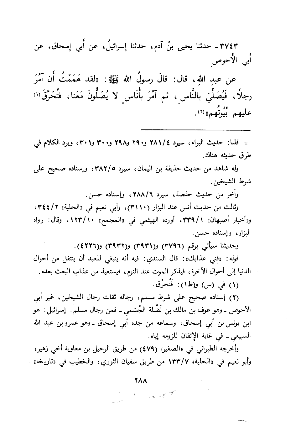 ٣٧٤٣ - حَدَّثَنَا يَحْيَى بْنُ آدَمَ، حَدَّثَنَا إِسْرَائِيلُ، عَنْ أَبِي إِسْحَاقَ، عَنْ أَبِي الْأَحْوَصِ، عَنْ عَبْدِ اللهِ، قَالَ: قَالَ رَسُولُ اللهِ صَلَّى اللهُ عَلَيْهِ وَسَلَّمَ: " لَقَدْ هَمَمْتُ أَنْ آمُرَ رَجُلًا، فَيُصَلِّيَ بِالنَّاسِ، ثُمَّ آمُرَ بِأُنَاسٍ لَا يُصَلُّونَ مَعَنَا، فَتُحَرَّقَ (١) عَلَيْهِمْ بُيُوتُهُمْ " (٢)
