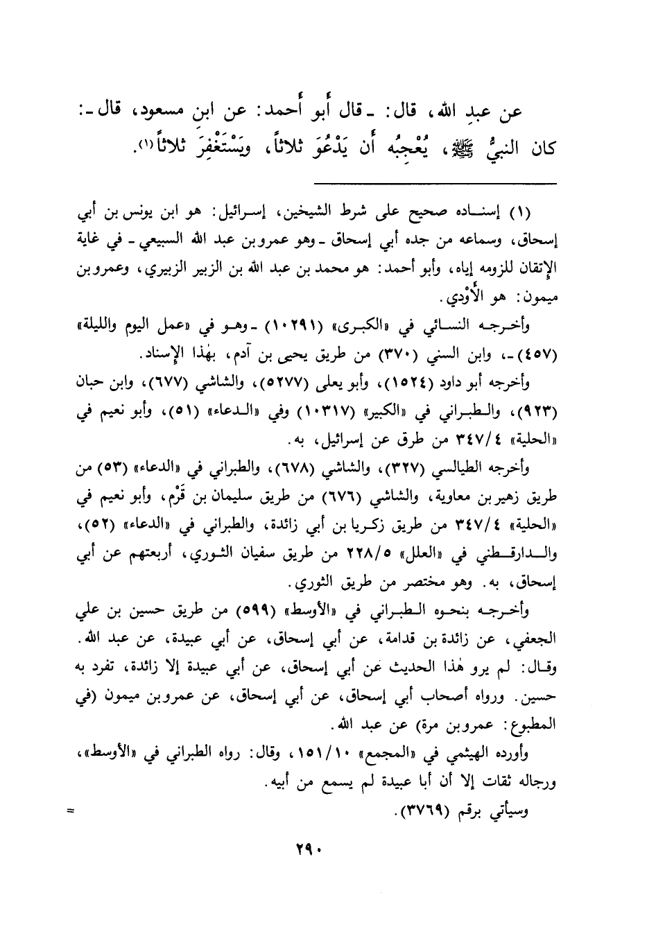 عَنْ عَبْدِ اللهِ، قَالَ - قَالَ أَبُو أَحْمَدَ: عَنِ ابْنِ مَسْعُودٍ، قَالَ -: " كَانَ النَّبِيُّ صَلَّى اللهُ عَلَيْهِ وَسَلَّمَ يُعْجِبُهُ أَنْ يَدْعُوَ ثَلَاثًا، وَيَسْتَغْفِرَ ثَلَاثًا " (١)