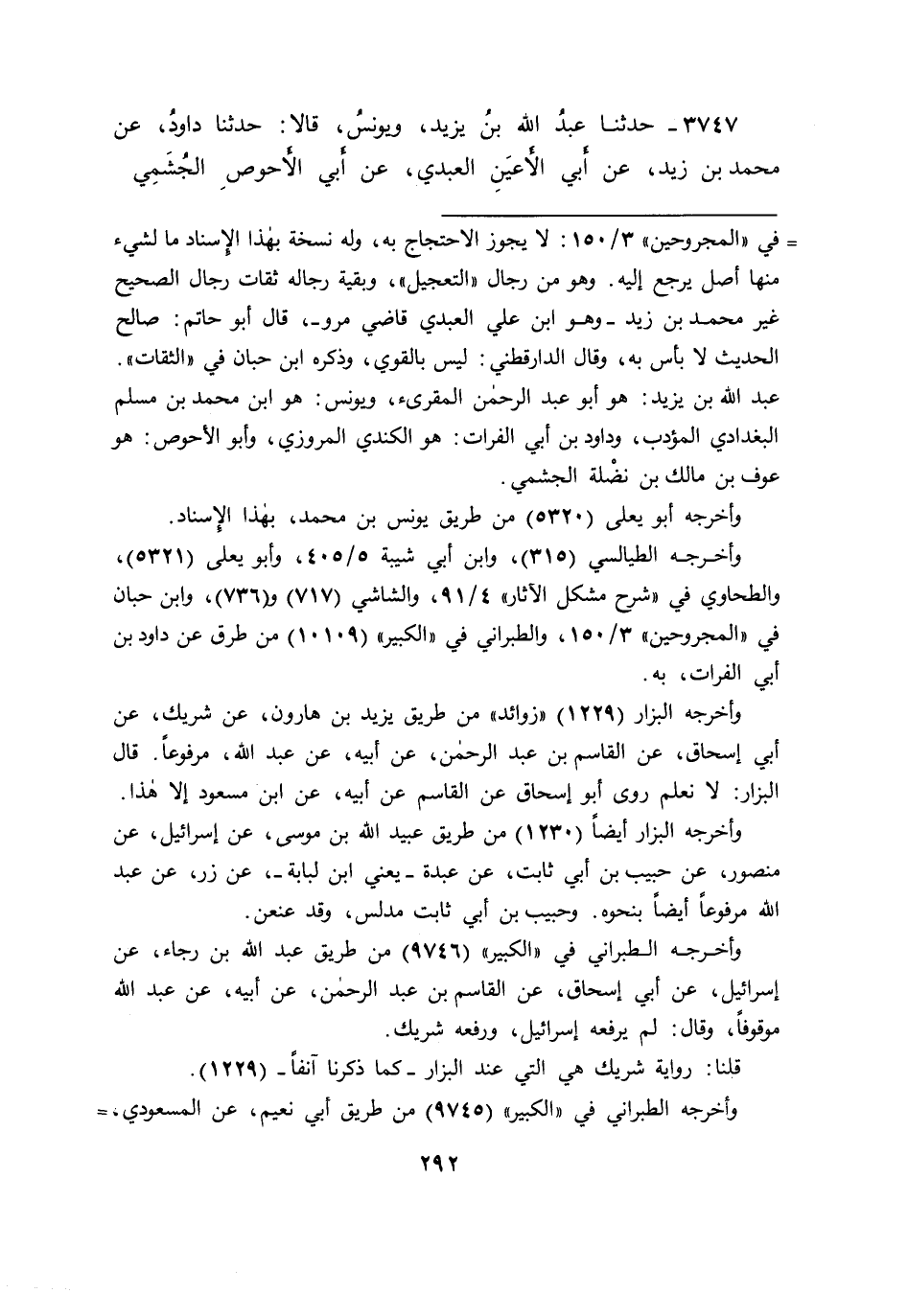 ٣٧٤٧ - حَدَّثَنَا عَبْدُ اللهِ بْنُ يَزِيدَ، وَيُونُسُ، قَالَا: حَدَّثَنَا دَاوُدُ، عَنْ مُحَمَّدِ بْنِ زَيْدٍ، عَنْ أَبِي الْأَعْيَنِ الْعَبْدِيِّ، عَنْ أَبِي الْأَحْوَصِ الْجُشَمِيِّ،