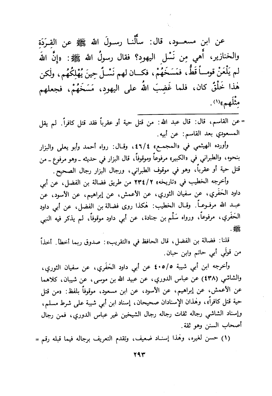 عَنِ ابْنِ مَسْعُودٍ، قَالَ: سَأَلْنَا رَسُولَ اللهِ صَلَّى اللهُ عَلَيْهِ وَسَلَّمَ عَنِ الْقِرَدَةِ وَالْخَنَازِيرِ، أَهِيَ مِنْ نَسْلِ الْيَهُودِ؟ فَقَالَ رَسُولُ اللهِ صَلَّى اللهُ عَلَيْهِ وَسَلَّمَ: " إِنَّ اللهَ لَمْ يَلْعَنْ قَوْمًا قَطُّ، فَمَسَخَهُمْ، فَكَانَ لَهُمْ نَسْلٌ حِينَ يُهْلِكُهُمْ، وَلَكِنْ هَذَا خَلْقٌ كَانَ، فَلَمَّا غَضِبَ اللهُ عَلَى الْيَهُودِ، مَسَخَهُمْ فَجَعَلَهُمْ مِثْلَهُمْ " (١)