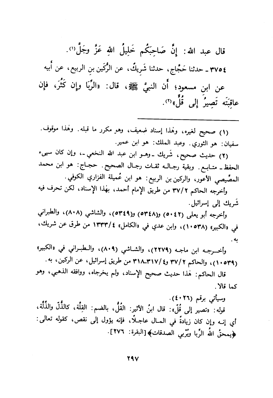 ٣٧٥٤ - حَدَّثَنَا حَجَّاجٌ، حَدَّثَنَا شَرِيكٌ، عَنِ الرُّكَيْنِ بْنِ الرَّبِيعِ، عَنْ أَبِيهِ، عَنِ ابْنِ مَسْعُودٍ، أَنَّ النَّبِيَّ صَلَّى اللهُ عَلَيْهِ وَسَلَّمَ، قَالَ: " الرِّبَا وَإِنْ كَثُرَ، فَإِنَّ عَاقِبَتَهُ تَصِيرُ إِلَى قُلٍّ " (٢)