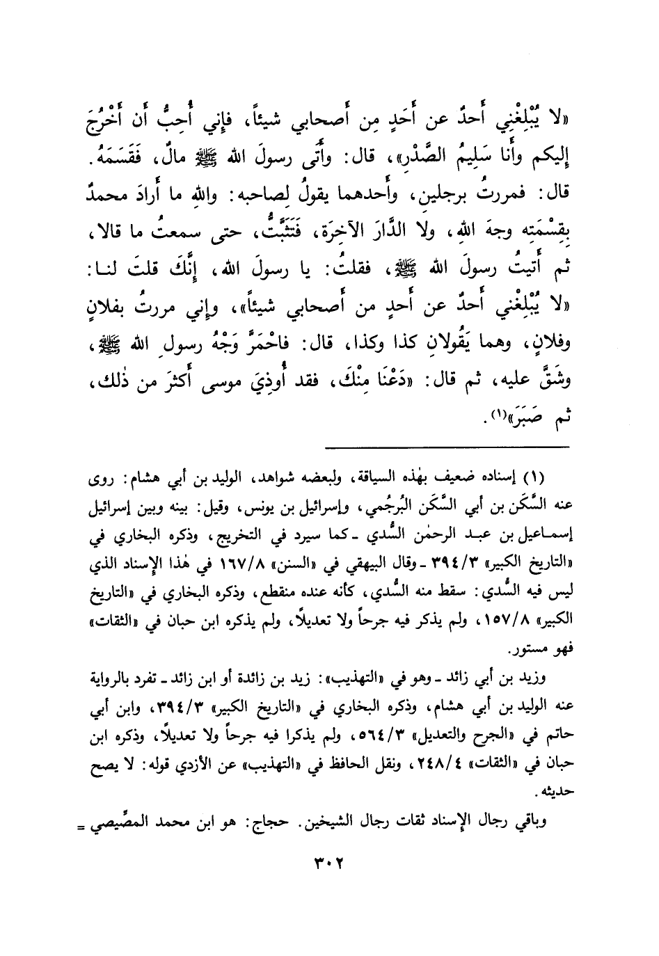 لَا يُبَلِّغْنِي أَحَدٌ عَنْ أَحَدٍ مِنْ أَصْحَابِي شَيْئًا؛ فَإِنِّي أُحِبُّ أَنْ أَخْرُجَ إِلَيْكُمْ وَأَنَا سَلِيمُ الصَّدْرِ "، قَالَ: وَأَتَى رَسُولَ اللهِ صَلَّى اللهُ عَلَيْهِ وَسَلَّمَ مَالٌ، فَقَسَمَهُ. قَالَ: فَمَرَرْتُ بِرَجُلَيْنِ، وَأَحَدُهُمَا يَقُولُ لِصَاحِبِهِ: وَاللهِ مَا أَرَادَ مُحَمَّدٌ بِقِسْمَتِهِ وَجْهَ اللهِ، وَلَا الدَّارَ الْآخِرَةَ، فَتَثَبَّتُّ، حَتَّى سَمِعْتُ مَا قَالَا، ثُمَّ أَتَيْتُ رَسُولَ اللهِ صَلَّى اللهُ عَلَيْهِ وَسَلَّمَ، فَقُلْتُ: يَا رَسُولَ اللهِ، إِنَّكَ قُلْتَ لَنَا: " لَا يُبَلِّغْنِي أَحَدٌ عَنْ أَحَدٍ مِنْ أَصْحَابِي شَيْئًا "، وَإِنِّي مَرَرْتُ بِفُلَانٍ وَفُلَانٍ، وَهُمَا يَقُولَانِ كَذَا وَكَذَا، قَالَ: فَاحْمَرَّ وَجْهُ رَسُولِ اللهِ صَلَّى اللهُ عَلَيْهِ وَسَلَّمَ، وَشَقَّ عَلَيْهِ، ثُمَّ قَالَ: " دَعْنَا مِنْكَ، فَقَدْ أُوذِيَ مُوسَى أَكْثَرَ مِنْ ذَلِكَ، ثُمَّ صَبَرَ " (١)