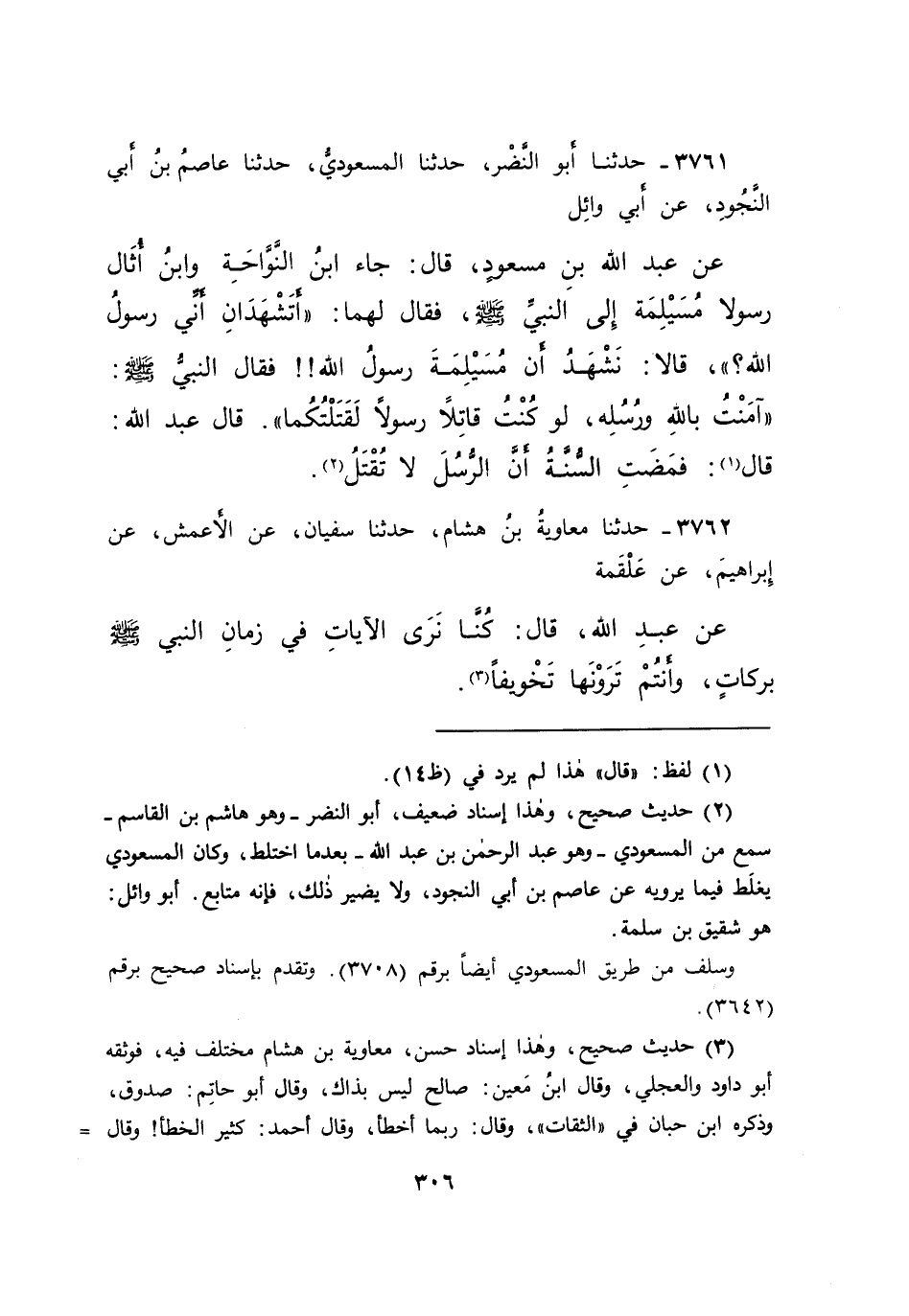 ٣٧٦١ - حَدَّثَنَا أَبُو النَّضْرِ، حَدَّثَنَا الْمَسْعُودِيُّ، حَدَّثَنَا عَاصِمُ بْنُ أَبِي النَّجُودِ، عَنْ أَبِي وَائِلٍ، عَنْ عَبْدِ اللهِ بْنِ مَسْعُودٍ، قَالَ: جَاءَ ابْنُ النَّوَّاحَةِ وَابْنُ أُثَالٍ رَسُولَا مُسَيْلِمَةَ إِلَى النَّبِيِّ صَلَّى اللهُ عَلَيْهِ وَسَلَّمَ، فَقَالَ لَهُمَا: " أَتَشْهَدَانِ أَنِّي رَسُولُ اللهِ؟ "، قَالَا: نَشْهَدُ أَنَّ مُسَيْلِمَةَ رَسُولُ اللهِ فَقَالَ النَّبِيُّ صَلَّى اللهُ عَلَيْهِ وَسَلَّمَ: " آمنْتُ بِاللهِ وَرُسُلِهِ، لَوْ كُنْتُ قَاتِلًا رَسُولًا لَقَتَلْتُكُمَا " قَالَ عَبْدُ اللهِ: " قَالَ (١) : فَمَضَتِ السُّنَّةُ أَنَّ الرُّسُلَ لَا تُقْتَلُ " (٢)
