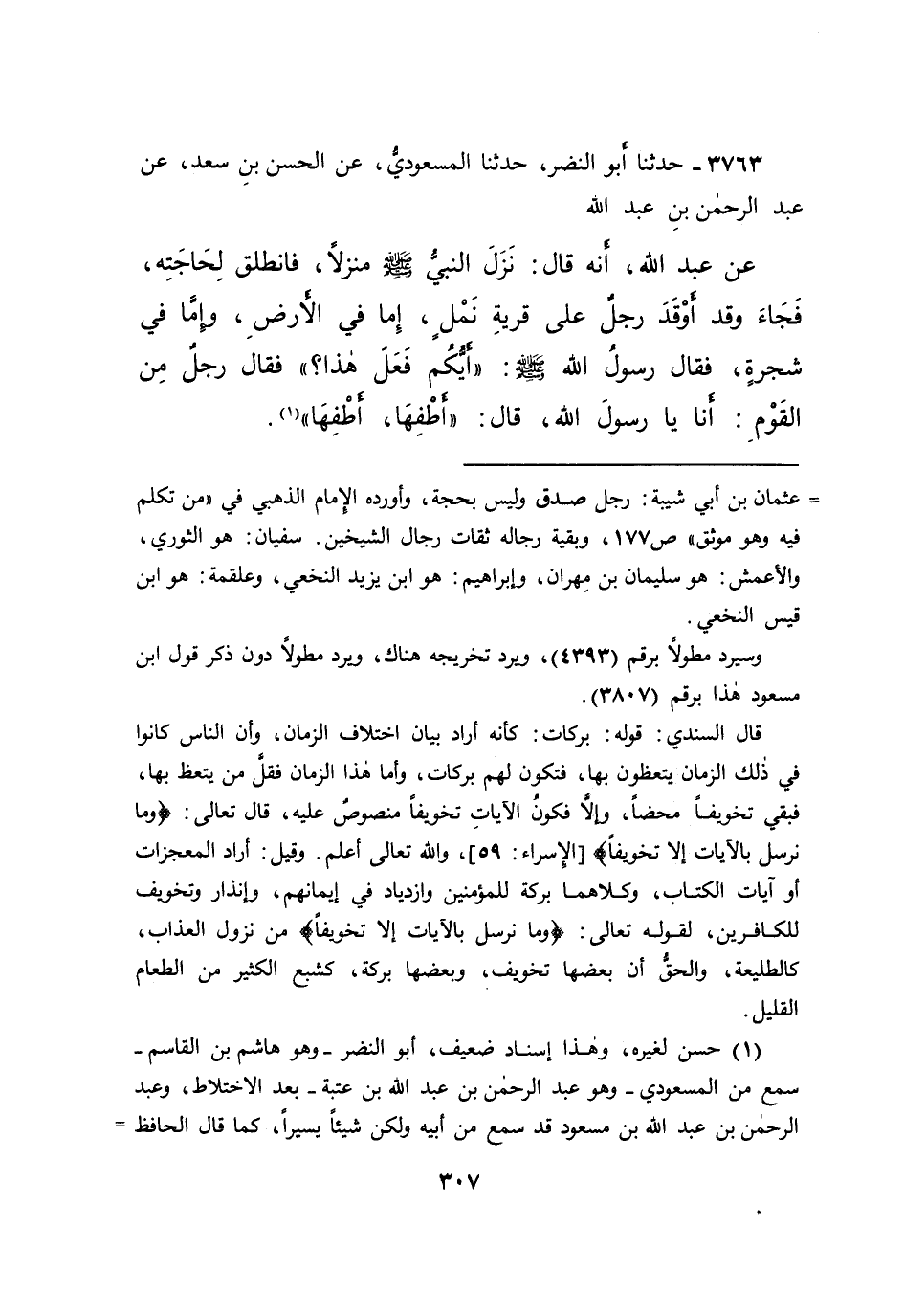 ٣٧٦٣ - حَدَّثَنَا أَبُو النَّضْرِ، حَدَّثَنَا الْمَسْعُودِيُّ، عَنِ الْحَسَنِ بْنِ سَعْدٍ، عَنْ عَبْدِ الرَّحْمَنِ بْنِ عَبْدِ اللهِ، عَنْ عَبْدِ اللهِ، أَنَّهُ قَالَ: نَزَلَ النَّبِيُّ صَلَّى اللهُ عَلَيْهِ وَسَلَّمَ مَنْزِلًا، فَانْطَلَقَ لِحَاجَتِهِ، فَجَاءَ وَقَدْ أَوْقَدَ رَجُلٌ عَلَى قَرْيَةِ نَمْلٍ، إِمَّا فِي الْأَرْضِ، وَإِمَّا فِي شَجَرَةٍ، فَقَالَ رَسُولُ اللهِ صَلَّى اللهُ عَلَيْهِ وَسَلَّمَ: " أَيُّكُمْ فَعَلَ هَذَا؟ " فَقَالَ رَجُلٌ مِنَ الْقَوْمِ: أَنَا يَا رَسُولَ اللهِ، قَالَ: " أَطْفِهَا، أَطْفِهَا " (١)