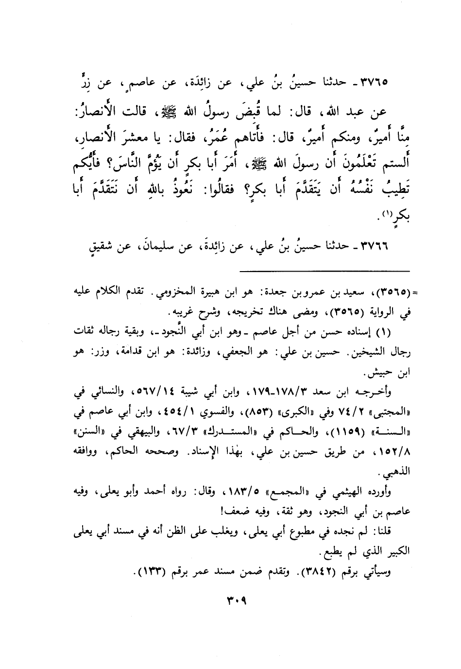 ٣٧٦٥ - حَدَّثَنَا حُسَيْنُ بْنُ عَلِيٍّ، عَنْ زَائِدَةَ، عَنْ عَاصِمٍ، عَنْ زِرٍّ، عَنْ عَبْدِ اللهِ، قَالَ: لَمَّا قُبِضَ رَسُولُ اللهِ صَلَّى اللهُ عَلَيْهِ وَسَلَّمَ، قَالَتِ الْأَنْصَارُ: مِنَّا أَمِيرٌ، وَمِنْكُمْ أَمِيرٌ، قَالَ: فَأَتَاهُمْ عُمَرُ، فَقَالَ: يَا مَعْشَرَ الْأَنْصَارِ، أَلَسْتُمْ تَعْلَمُونَ أَنَّ رَسُولَ اللهِ صَلَّى اللهُ عَلَيْهِ وَسَلَّمَ " أَمَرَ أَبَا بَكْرٍ أَنْ يَؤُمَّ النَّاسَ؟ " فَأَيُّكُمْ تَطِيبُ نَفْسُهُ أَنْ يَتَقَدَّمَ أَبَا بَكْرٍ؟ فَقَالُوا: نَعُوذُ بِاللهِ أَنْ نَتَقَدَّمَ أَبَا بَكْرٍ (١)