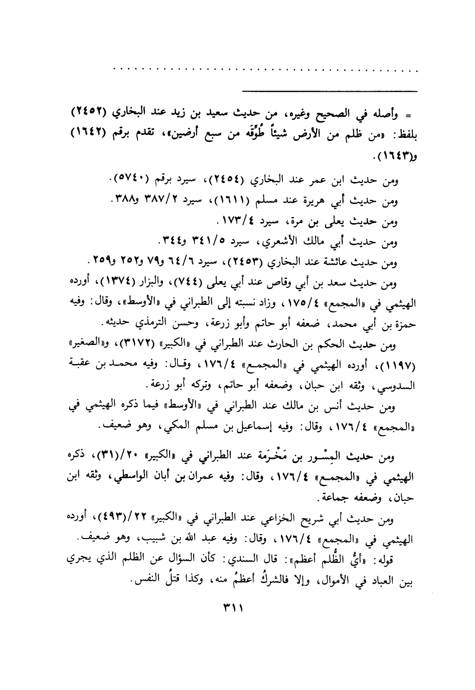 = وأصله في الصحيح وغيره، من حديث سعيد بن زيد عند البخاري (٢٤٥٢) بلفظ: "من ظلم من الأرض شيئاً طوقه من سبع أرضين"، تقدم برقم (١٦٤٢) و (١٦٤٣) .
