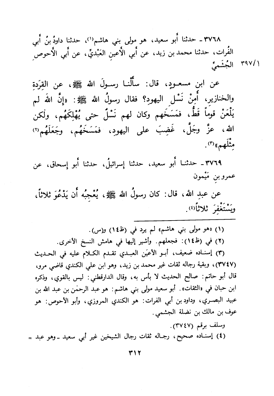 ٣٧٦٨ - حَدَّثَنَا أَبُو سَعِيدٍ هُوَ مَوْلَى بَنِي هَاشِمٍ (١) ، حَدَّثَنَا دَاوُدُ بْنُ أَبِي الْفُرَاتِ، حَدَّثَنَا مُحَمَّدُ بْنُ زَيْدٍ، عَنْ أَبِي الْأَعْيَنِ الْعَبْدِيِّ، عَنْ أَبِي الْأَحْوَصِ الْجُشَمِيِّ، عَنِ ابْنِ مَسْعُودٍ، قَالَ: سَأَلْنَا رَسُولَ اللهِ صَلَّى اللهُ عَلَيْهِ وَسَلَّمَ، عَنِ الْقِرَدَةِ وَالْخَنَازِيرِ، أَمِنْ نَسْلِ الْيَهُودِ؟ فَقَالَ رَسُولُ اللهِ صَلَّى اللهُ عَلَيْهِ وَسَلَّمَ: " إِنَّ اللهَ لَمْ يَلْعَنْ قَوْمًا قَطُّ، فَمَسَخَهُمْ وَكَانَ لَهُمْ نَسْلٌ حَتَّى يُهْلِكَهُمْ، وَلَكِنَّ اللهَ عَزَّ وَجَلَّ، غَضِبَ عَلَى الْيَهُودِ، فَمَسَخَهُمْ، وَجَعَلَهُمْ (٢) مِثْلَهُمْ " (٣)