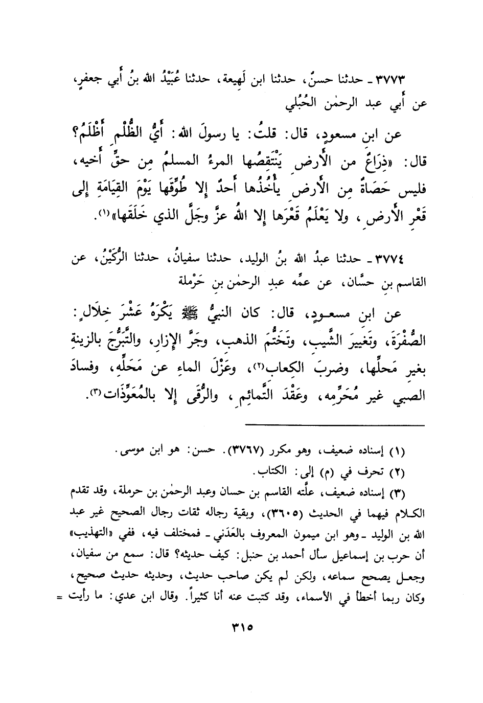 ٣٧٧٤ - حَدَّثَنَا عَبْدُ اللهِ بْنُ الْوَلِيدِ، حَدَّثَنَا سُفْيَانُ، حَدَّثَنَا الرُّكَيْنُ، عَنِ الْقَاسِمِ بْنِ حَسَّانَ، عَنْ عَمِّهِ عَبْدِ الرَّحْمَنِ بْنِ حَرْمَلَةَ، عَنِ ابْنِ مَسْعُودٍ، قَالَ: " كَانَ النَّبِيُّ صَلَّى اللهُ عَلَيْهِ وَسَلَّمَ يَكْرَهُ عَشْرَ خِلَالٍ: الصُّفْرَةَ، وَتَغْيِيرَ الشَّيْبِ، وَتَخَتُّمَ الذَّهَبِ، وَجَرَّ الْإِزَارِ، وَالتَّبَرُّجَ بِالزِّينَةِ بِغَيْرِ مَحِلِّهَا، وَضَرْبَ الْكِعَابِ (٢) وَعَزْلَ الْمَاءِ عَنْ مَحَلِّهِ، وَفَسَادَ الصَّبِيِّ غَيْرَ مُحَرِّمِهِ، وَعَقْدَ التَّمَائِمِ، وَالرُّقَى إِلَّا بِالْمُعَوِّذَاتِ " (٣)