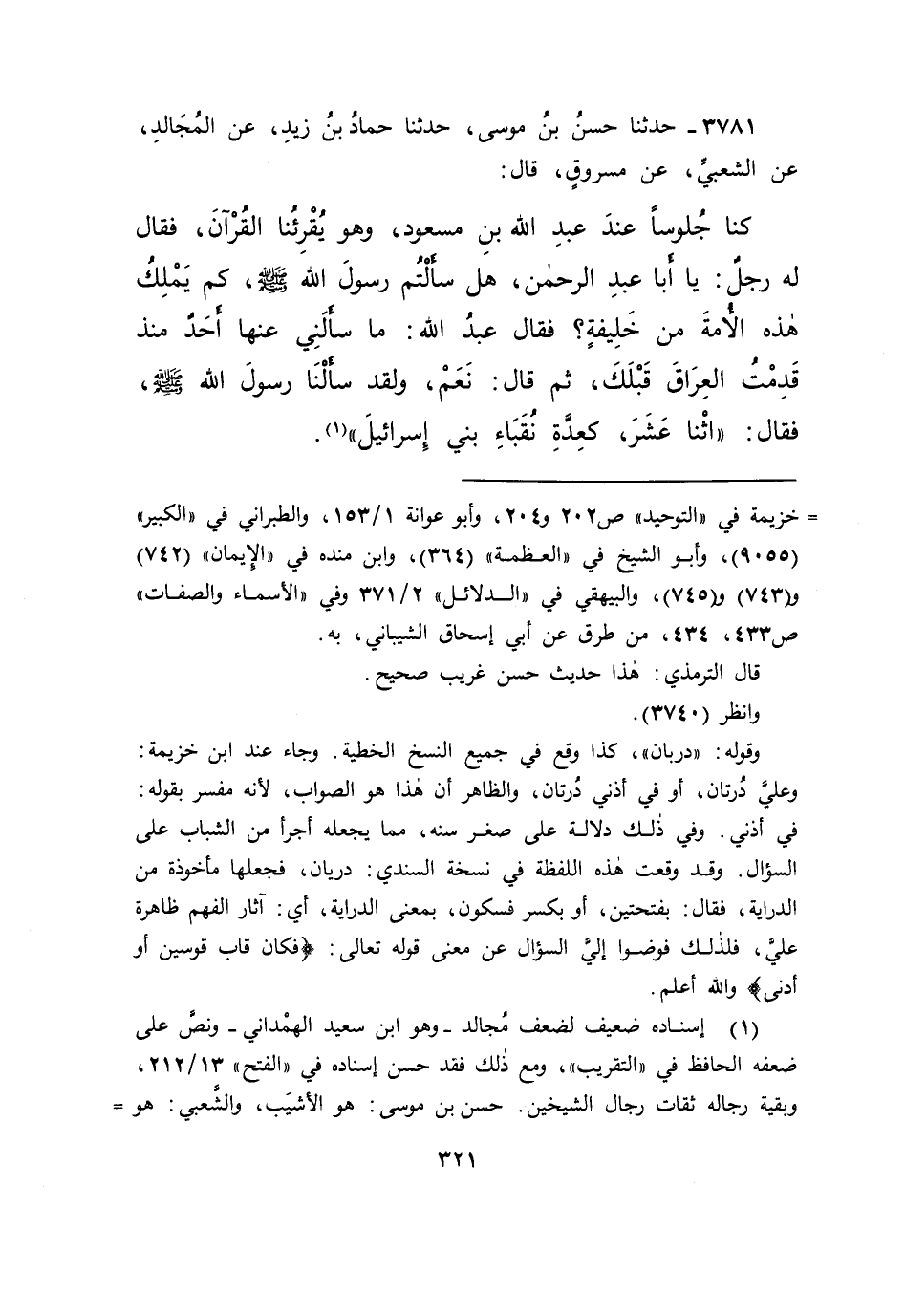 ٣٧٨١ - حَدَّثَنَا حَسَنُ بْنُ مُوسَى، حَدَّثَنَا حَمَّادُ بْنُ زَيْدٍ، عَنِ الْمُجَالِدِ، عَنِ الشَّعْبِيِّ، عَنْ مَسْرُوقٍ، قَالَ: كُنَّا جُلُوسًا عِنْدَ عَبْدِ اللهِ بْنِ مَسْعُودٍ، وَهُوَ يُقْرِئُنَا الْقُرْآنَ، فَقَالَ لَهُ رَجُلٌ: يَا أَبَا عَبْدِ الرَّحْمَنِ، هَلْ سَأَلْتُمْ رَسُولَ اللهِ صَلَّى اللهُ عَلَيْهِ وَسَلَّمَ، كَمْ تَمْلِكُ هَذِهِ الْأُمَّةُ مِنْ خَلِيفَةٍ؟ فَقَالَ عَبْدُ اللهِ: مَا سَأَلَنِي عَنْهَا أَحَدٌ مُنْذُ قَدِمْتُ الْعِرَاقَ قَبْلَكَ، ثُمَّ قَالَ: نَعَمْ، وَلَقَدْ سَأَلْنَا رَسُولَ اللهِ صَلَّى اللهُ عَلَيْهِ وَسَلَّمَ، فَقَالَ: " اثْنَا عَشَرَ، كَعِدَّةِ نُقَبَاءِ بَنِي إِسْرَائِيلَ " (١)