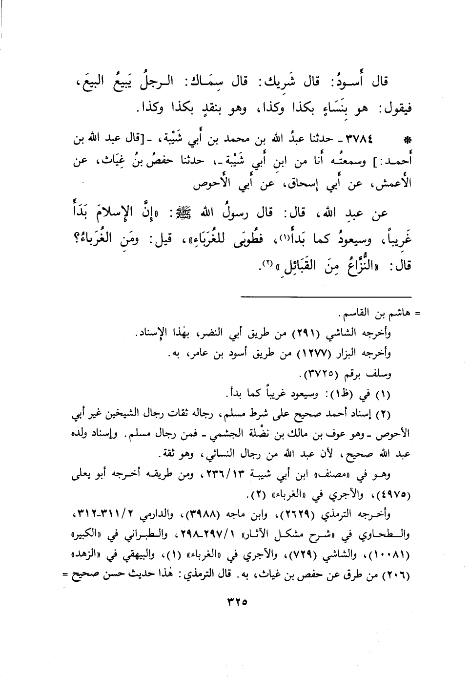 * ٣٧٨٤ - حَدَّثَنَا عَبْدُ اللهِ بْنُ مُحَمَّدِ بْنِ أَبِي شَيْبَةَ، قَالَ عَبْدُ اللهِ بْنُ أَحْمَدَ: وَسَمِعْتُهُ أَنَا مِنَ ابْنِ أَبِي شَيْبَةَ، حَدَّثَنَا حَفْصُ بْنُ غِيَاثٍ، عَنِ الْأَعْمَشِ، عَنْ أَبِي إِسْحَاقَ، عَنْ أَبِي الْأَحْوَصِ، عَنْ عَبْدِ اللهِ قَالَ: قَالَ رَسُولُ اللهِ صَلَّى اللهُ عَلَيْهِ وَسَلَّمَ: " إِنَّ الْإِسْلَامَ بَدَأَ غَرِيبًا، وَسَيَعُودُ كَمَا بَدَأَ (١) ، فَطُوبَى لِلْغُرَبَاءِ "، قِيلَ: وَمَنِ الْغُرَبَاءُ؟ قَالَ: " النُّزَّاعُ مِنَ الْقَبَائِلِ " (٢)