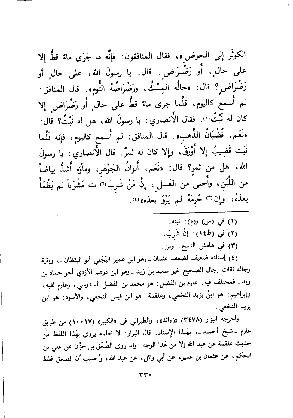 الْكَوْثَرِ إِلَى الْحَوْضِ "، فَقَالَ الْمُنَافِقُونَ: فَإِنَّهُ مَا جَرَى مَاءٌ قَطُّ إِلَّا عَلَى حَالٍ، أَوْ رَضْرَاضٍ. قَالَ: يَا رَسُولَ اللهِ، عَلَى حَالٍ أَوْ رَضْرَاضٍ؟ قَالَ: " حَالُهُ الْمِسْكُ، وَرَضْرَاضُهُ التُّومُ "، قَالَ الْمُنَافِقُ: لَمْ أَسْمَعْ كَالْيَوْمِ، قَلَّمَا جَرَى مَاءٌ قَطُّ عَلَى حَالٍ أَوْ رَضْرَاضٍ، إِلَّا كَانَ لَهُ نَبْتٌ (١) ، فَقَالَ الْأَنْصَارِيُّ: يَا رَسُولَ اللهِ، هَلْ لَهُ نَبْتٌ؟ قَالَ: " نَعَمْ، قُضْبَانُ الذَّهَبِ "، قَالَ الْمُنَافِقُ: لَمْ أَسْمَعْ كَالْيَوْمِ، فَإِنَّهُ قَلَّمَا نَبَتَ قَضِيبٌ إِلَّا أَوْرَقَ، وَإِلَّا كَانَ لَهُ ثَمَرٌ. قَالَ الْأَنْصَارِيُّ: يَا رَسُولَ اللهِ، هَلْ مِنْ ثَمَرٍ؟ قَالَ: " نَعَمْ، أَلْوَانُ الْجَوْهَرِ، وَمَاؤُهُ أَشَدُّ بَيَاضًا مِنَ اللَّبَنِ، وَأَحْلَى مِنَ الْعَسَلِ، إِنَّ مَنْ شَرِبَ (٢) مِنْهُ مَشْرَبًا، لَمْ يَظْمَأْ بَعْدَهُ، وَإِنْ (٣) حُرِمَهُ لَمْ يُرْوَ بَعْدَهُ " (٤)