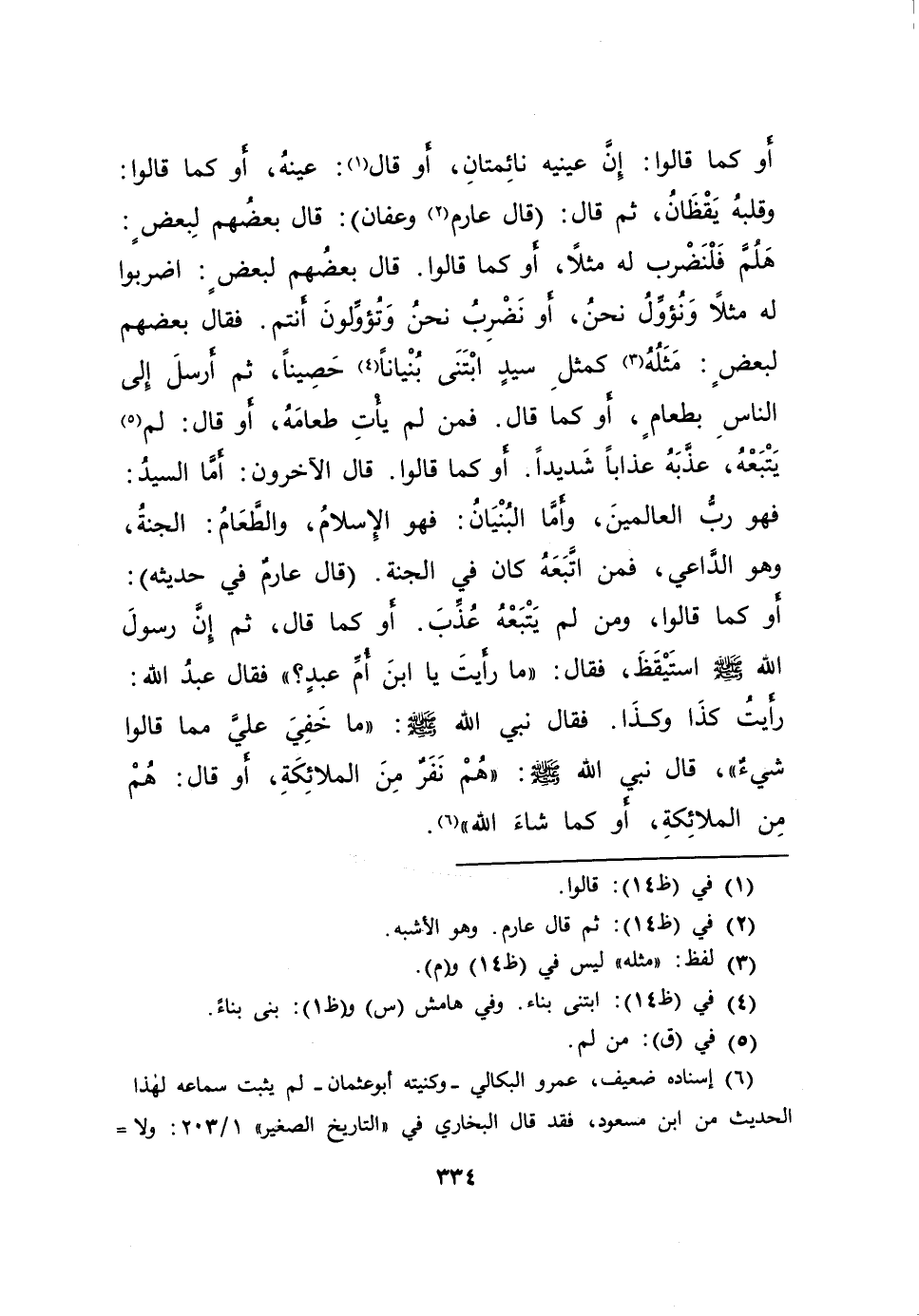أَوْ كَمَا قَالُوا: إِنَّ عَيْنَيْهِ نَائِمَتَانِ، أَوْ قَالَ (١) : عَيْنَهُ، أَوْ كَمَا قَالُوا: وَقَلْبَهُ يَقْظَانُ، ثُمَّ قَالَ: - قَالَ عَارِمٌ (٢) وَعَفَّانُ -: قَالَ بَعْضُهُمْ لِبَعْضٍ: هَلُمَّ فَلْنَضْرِبْ لَهُ مَثَلًا، أَوْ كَمَا قَالُوا. قَالَ بَعْضُهُمْ لِبَعْضٍ: اضْرِبُوا لَهُ مَثَلًا وَنُؤَوِّلُ نَحْنُ، أَوْ نَضْرِبُ نَحْنُ وَتُؤَوِّلُونَ أَنْتُمْ. فَقَالَ بَعْضُهُمْ لِبَعْضٍ: مَثَلُهُ (٣) كَمَثَلِ سَيِّدٍ ابْتَنَى بُنْيَانًا (٤) حَصِينًا، ثُمَّ أَرْسَلَ إِلَى النَّاسِ بِطَعَامٍ، أَوْ كَمَا قَالَ. فَمَنْ لَمْ يَأْتِ طَعَامَهُ، أَوْ قَالَ: لَمْ (٥) يَتْبَعْهُ، عَذَّبَهُ عَذَابًا شَدِيدًا، أَوْ كَمَا قَالُوا. قَالَ الْآخَرُونَ: أَمَّا السَّيِّدُ: فَهُوَ رَبُّ الْعَالَمِينَ، وَأَمَّا الْبُنْيَانُ: فَهُوَ الْإِسْلَامُ، وَالطَّعَامُ: الْجَنَّةُ وَهُوَ الدَّاعِي، فَمَنِ اتَّبَعَهُ كَانَ فِي الْجَنَّةِ. - قَالَ عَارِمٌ فِي حَدِيثِهِ -: أَوْ كَمَا قَالُوا، وَمَنْ لَمْ يَتَّبِعْهُ عُذِّبَ، أَوْ كَمَا قَالَ، ثُمَّ إِنَّ رَسُولَ اللهِ صَلَّى اللهُ عَلَيْهِ وَسَلَّمَ اسْتَيْقَظَ، فَقَالَ: " مَا رَأَيْتَ يَا ابْنَ أُمِّ عَبْدٍ؟ " فَقَالَ عَبْدُ اللهِ: رَأَيْتُ كَذَا وَكَذَا. فَقَالَ النَّبِيُّ صَلَّى اللهُ عَلَيْهِ وَسَلَّمَ: " مَا خَفِيَ عَلَيَّ مِمَّا قَالُوا شَيْءٌ "، قَالَ نَبِيُّ اللهِ صَلَّى اللهُ عَلَيْهِ وَسَلَّمَ: " هُمْ نَفَرٌ مِنَ الْمَلَائِكَةِ - أَوْ قَالَ - هُمْ مِنَ الْمَلَائِكَةِ، أَوْ كَمَا شَاءَ اللهُ " (٦)