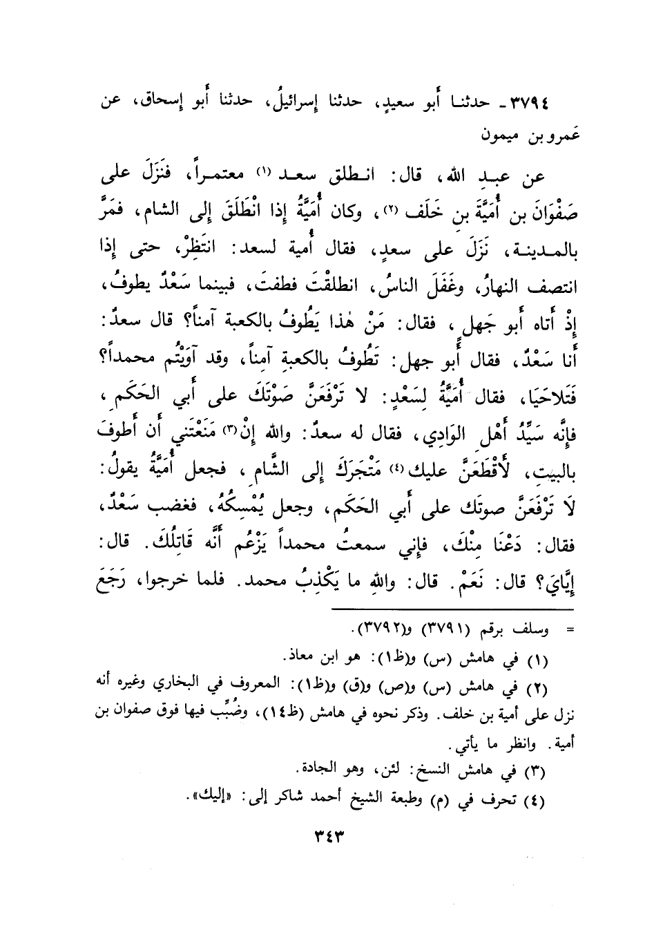 ٣٧٩٤ - حَدَّثَنَا أَبُو سَعِيدٍ، حَدَّثَنَا إِسْرَائِيلُ، حَدَّثَنَا أَبُو إِسْحَاقَ، عَنْ عَمْرِو بْنِ مَيْمُونٍ، عَنْ عَبْدِ اللهِ، قَالَ: انْطَلَقَ سَعْدٌ (١) مُعْتَمِرًا، فَنَزَلَ عَلَى صَفْوَانَ بْنِ أُمَيَّةَ بْنِ خَلَفٍ (٢) ، وَكَانَ أُمَيَّةُ إِذَا انْطَلَقَ إِلَى الشَّامِ، فَمَرَّ بِالْمَدِينَةِ، نَزَلَ عَلَى سَعْدٍ، فَقَالَ أُمَيَّةُ لِسَعْدٍ: انْتَظِرْ، حَتَّى إِذَا انْتَصَفَ النَّهَارُ، وَغَفَلَ النَّاسُ، انْطَلَقْتَ فَطُفْتَ، فَبَيْنَمَا سَعْدٌ يَطُوفُ، إِذْ أَتَاهُ أَبُو جَهْلٍ، فَقَالَ: مَنْ هَذَا يَطُوفُ بِالْكَعْبَةِ آمِنًا؟ قَالَ سَعْدٌ: أَنَا سَعْدٌ: فَقَالَ أَبُو جَهْلٍ: تَطُوفُ بِالْكَعْبَةِ آمِنًا، وَقَدْ آوَيْتُمْ مُحَمَّدًا فَتَلَاحَيَا، فَقَالَ أُمَيَّةُ لِسَعْدٍ: لَا تَرْفَعَنَّ صَوْتَكَ عَلَى أَبِي الْحَكَمِ، فَإِنَّهُ سَيِّدُ أَهْلِ الْوَادِي، فَقَالَ لَهُ سَعْدٌ: وَاللهِ إِنْ (٣) مَنَعْتَنِي أَنْ أَطُوفَ بِالْبَيْتِ، لَأَقْطَعَنَّ عَلَيْكَ (٤) مَتْجَرَكَ إِلَى الشَّأْمِ، فَجَعَلَ أُمَيَّةُ يَقُولُ: لَا تَرْفَعَنَّ صَوْتَكَ عَلَى أَبِي الْحَكَمِ، وَجَعَلَ يُمْسِكُهُ، فَغَضِبَ سَعْدٌ، فَقَالَ: دَعْنَا مِنْكَ، " فَإِنِّي سَمِعْتُ مُحَمَّدًا يَزْعُمُ أَنَّهُ قَاتِلُكَ ". قَالَ: إِيَّايَ؟ قَالَ: نَعَمْ. قَالَ: وَاللهِ مَا يَكْذِبُ مُحَمَّدٌ، فَلَمَّا خَرَجُوا، رَجَعَ