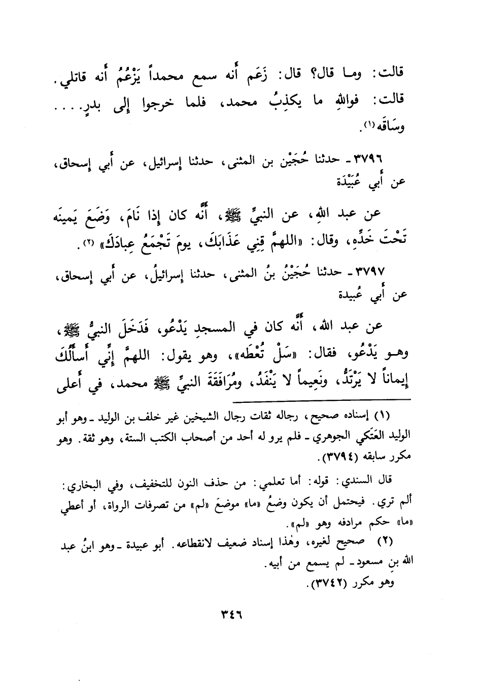 ٣٧٩٦ - حَدَّثَنَا حُجَيْنُ بْنُ الْمُثَنَّي، حَدَّثَنَا إِسْرَائِيلُ، عَنْ أَبِي إِسْحَاقَ، عَنْ أَبِي عُبَيْدَةَ، عَنْ عَبْدِ اللهِ، عَنِ النَّبِيِّ صَلَّى اللهُ عَلَيْهِ وَسَلَّمَ، أَنَّهُ كَانَ إِذَا نَامَ، وَضَعَ يَمِينَهُ تَحْتَ خَدِّهِ، وَقَالَ: " اللهُمَّ قِنِي عَذَابَكَ، يَوْمَ تَجْمَعُ عِبَادَكَ " (٢)