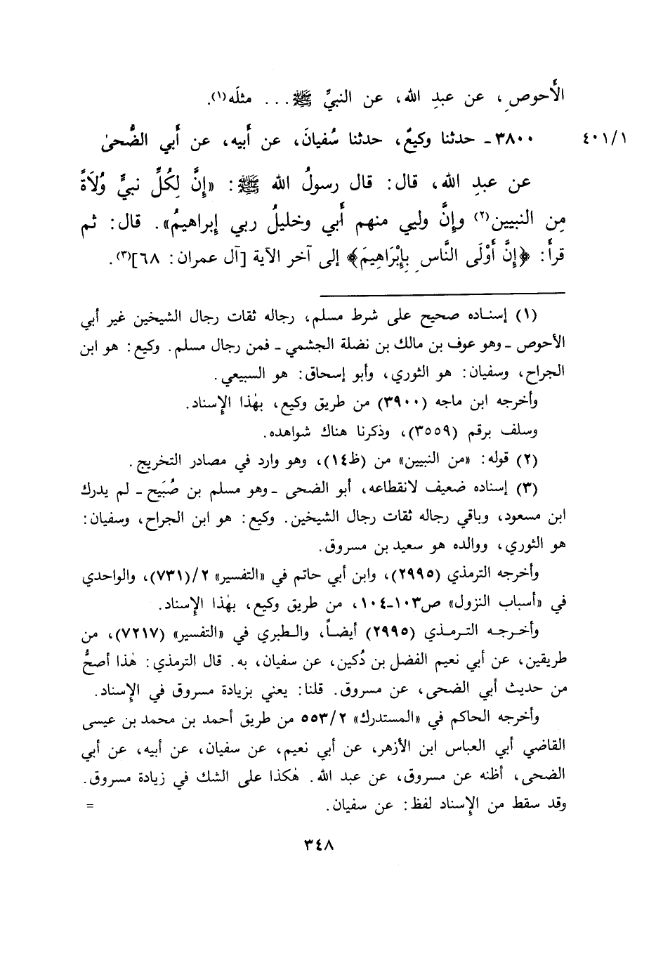 ٣٨٠٠ - حَدَّثَنَا وَكِيعٌ، حَدَّثَنَا سُفْيَانُ، عَنْ أَبِيهِ، عَنْ أَبِي الضُّحَى، عَنْ عَبْدِ اللهِ، قَالَ: قَالَ رَسُولُ اللهِ صَلَّى اللهُ عَلَيْهِ وَسَلَّمَ: " إِنَّ لِكُلِّ نَبِيٍّ وُلَاةً مِنَ النَّبِيِّينَ (٢) وَإِنَّ وَلِيِّي مِنْهُمْ أَبِي وَخَلِيلُ رَبِّي إِبْرَاهِيمُ ". قَالَ: ثُمَّ قَرَأَ: {إِنَّ أَوْلَى النَّاسِ بِإِبْرَاهِيمَ} [آل عمران: ٦٨] إِلَى آخِرِ الْآيَةَ (٣)