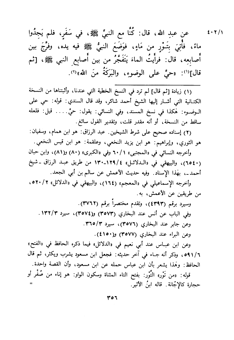 عَنْ عَبْدِ اللهِ، قَالَ: كُنَّا مَعَ النَّبِيِّ صَلَّى اللهُ عَلَيْهِ وَسَلَّمَ فِي سَفَرٍ، فَلَمْ يَجِدُوا مَاءً، فَأُتِيَ بِتَوْرٍ مِنْ مَاءٍ، فَوَضَعَ النَّبِيُّ صَلَّى اللهُ عَلَيْهِ وَسَلَّمَ فِيهِ يَدَهُ، وَفَرَّجَ بَيْنَ أَصَابِعِهِ، قَالَ: فَرَأَيْتُ الْمَاءَ يَتَفَجَّرُ مِنْ بَيْنِ أَصَابِعِ النَّبِيِّ صَلَّى اللهُ عَلَيْهِ وَسَلَّمَ، [ثُمَّ قَالَ] (١) : " حَيَّ عَلَى الْوُضُوءِ، وَالْبَرَكَةُ مِنَ اللهِ " (٢)