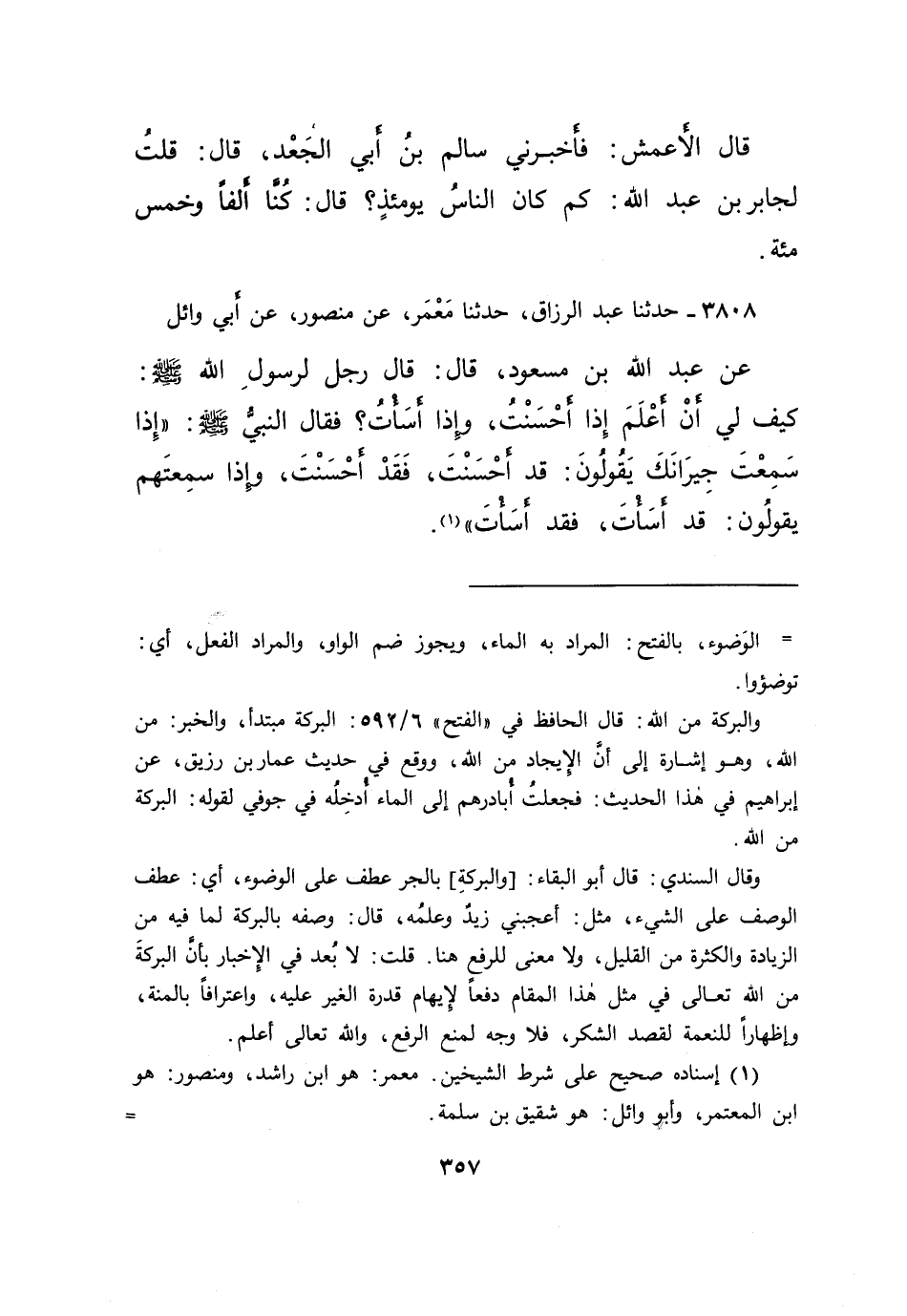 ٣٨٠٨ - حَدَّثَنَا عَبْدُ الرَّزَّاقِ، حَدَّثَنَا مَعْمَرٌ، عَنْ مَنْصُورٍ، عَنْ أَبِي وَائِلٍ، عَنْ عَبْدِ اللهِ بْنِ مَسْعُودٍ، قَالَ: قَالَ رَجُلٌ لِرَسُولِ اللهِ صَلَّى اللهُ عَلَيْهِ وَسَلَّمَ: كَيْفَ لِي أَنْ أَعْلَمَ إِذَا أَحْسَنْتُ، وَإِذَا أَسَأْتُ؟ فَقَالَ النَّبِيُّ صَلَّى اللهُ عَلَيْهِ وَسَلَّمَ: " إِذَا سَمِعْتَ جِيرَانَكَ يَقُولُونَ: قَدْ أَحْسَنْتَ، فَقَدْ أَحْسَنْتَ، وَإِذَا سَمِعْتَهُمْ يَقُولُونَ: قَدْ أَسَأْتَ، فَقَدْ أَسَأْتَ " (١)