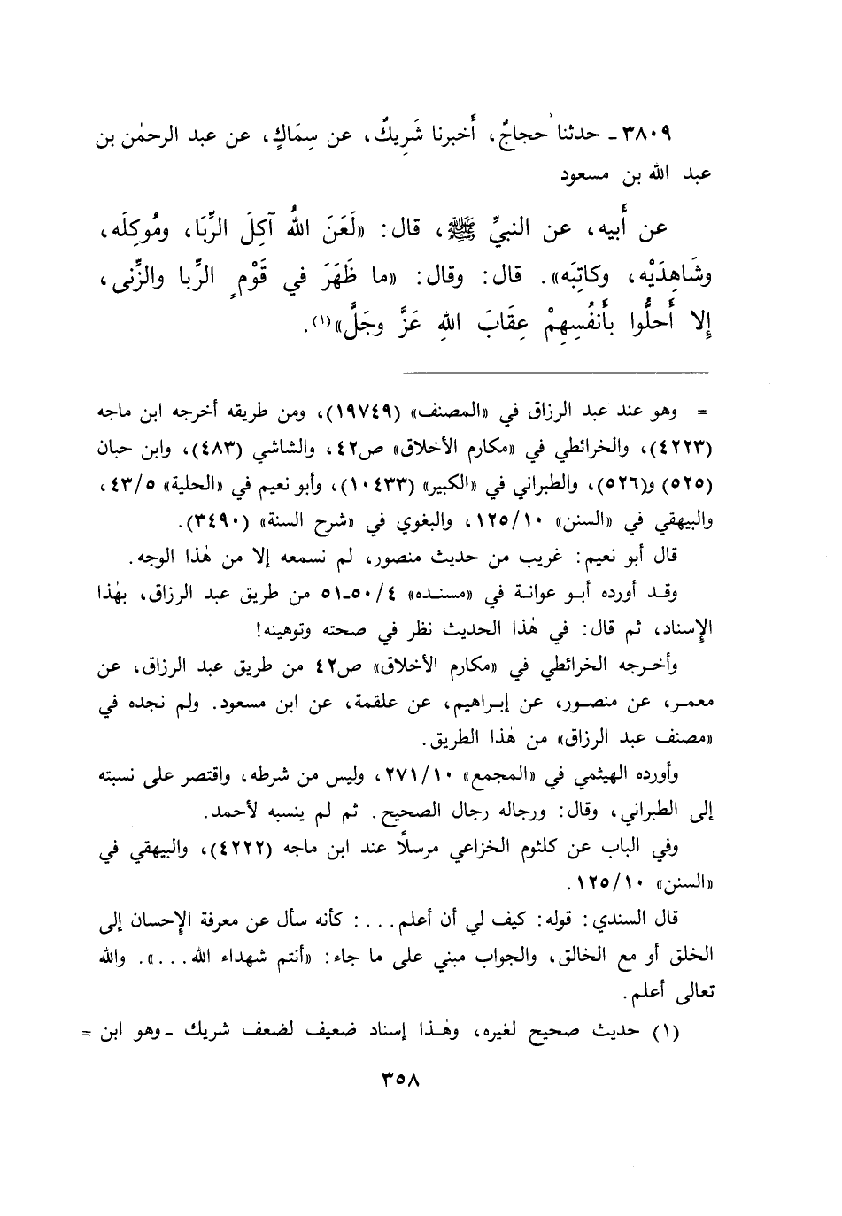 ٣٨٠٩ - حَدَّثَنَا حَجَّاجٌ، أَخْبَرَنَا شَرِيكٌ، عَنْ سِمَاكٍ، عَنْ عَبْدِ الرَّحْمَنِ بْنِ عَبْدِ اللهِ بْنِ مَسْعُودٍ، عَنْ أَبِيهِ، عَنِ النَّبِيِّ صَلَّى اللهُ عَلَيْهِ وَسَلَّمَ قَالَ: " لَعَنَ اللهُ آكِلَ الرِّبَا، وَمُوكِلَهُ، وَشَاهِدَيْهِ، وَكَاتِبَهُ "