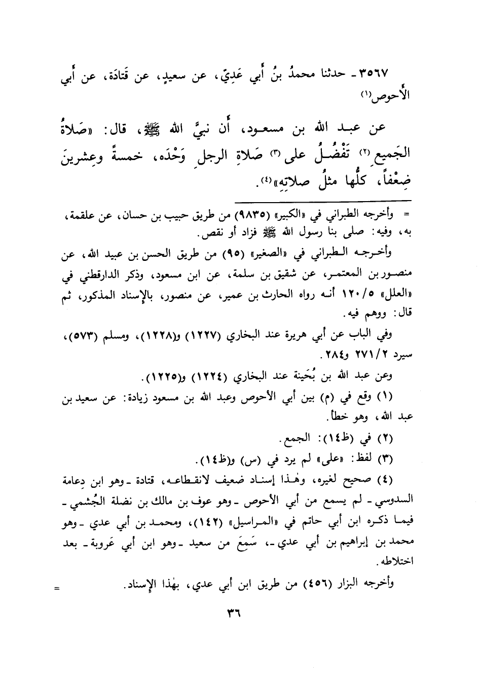 ٣٥٦٧ - حَدَّثَنَا مُحَمَّدُ بْنُ أَبِي عَدِيٍّ، عَنْ سَعِيدٍ، عَنْ قَتَادَةَ، عَنْ أَبِي الْأَحْوَصِ (١) ، عَنْ عَبْدِ اللهِ بْنِ مَسْعُودٍ، أَنَّ نَبِيَّ اللهِ صَلَّى اللهُ عَلَيْهِ وَسَلَّمَ قَالَ: " صَلَاةُ الْجَمِيعِ (٢) تَفْضُلُ عَلَى (٣) صَلَاةِ الرَّجُلِ وَحْدَهُ، خَمْسَةً وَعِشْرِينَ ضِعْفًا، كُلُّهَا مِثْلُ صَلَاتِهِ " (٤)