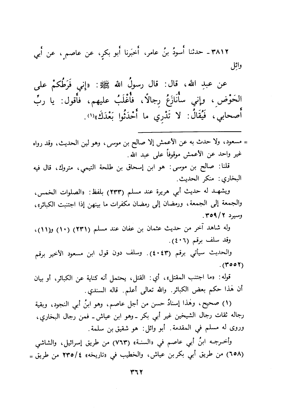 ٣٨١٢ - حَدَّثَنَا أَسْوَدُ بْنُ عَامِرٍ، أَخْبَرَنَا أَبُو بَكْرٍ، عَنْ عَاصِمٍ، عَنْ أَبِي وَائِلٍ، عَنْ عَبْدِ اللهِ، قَالَ: قَالَ رَسُولُ اللهِ صَلَّى اللهُ عَلَيْهِ وَسَلَّمَ: " إِنِّي فَرَطُكُمْ عَلَى الْحَوْضِ، وَإِنِّي سَأُنَازَعُ رِجَالًا، فَأُغْلَبُ عَلَيْهِمْ، فَأَقُولُ: يَا رَبِّ أَصْحَابِي، فَيُقَالُ: لَا تَدْرِي مَا أَحْدَثُوا بَعْدَكَ " (١)