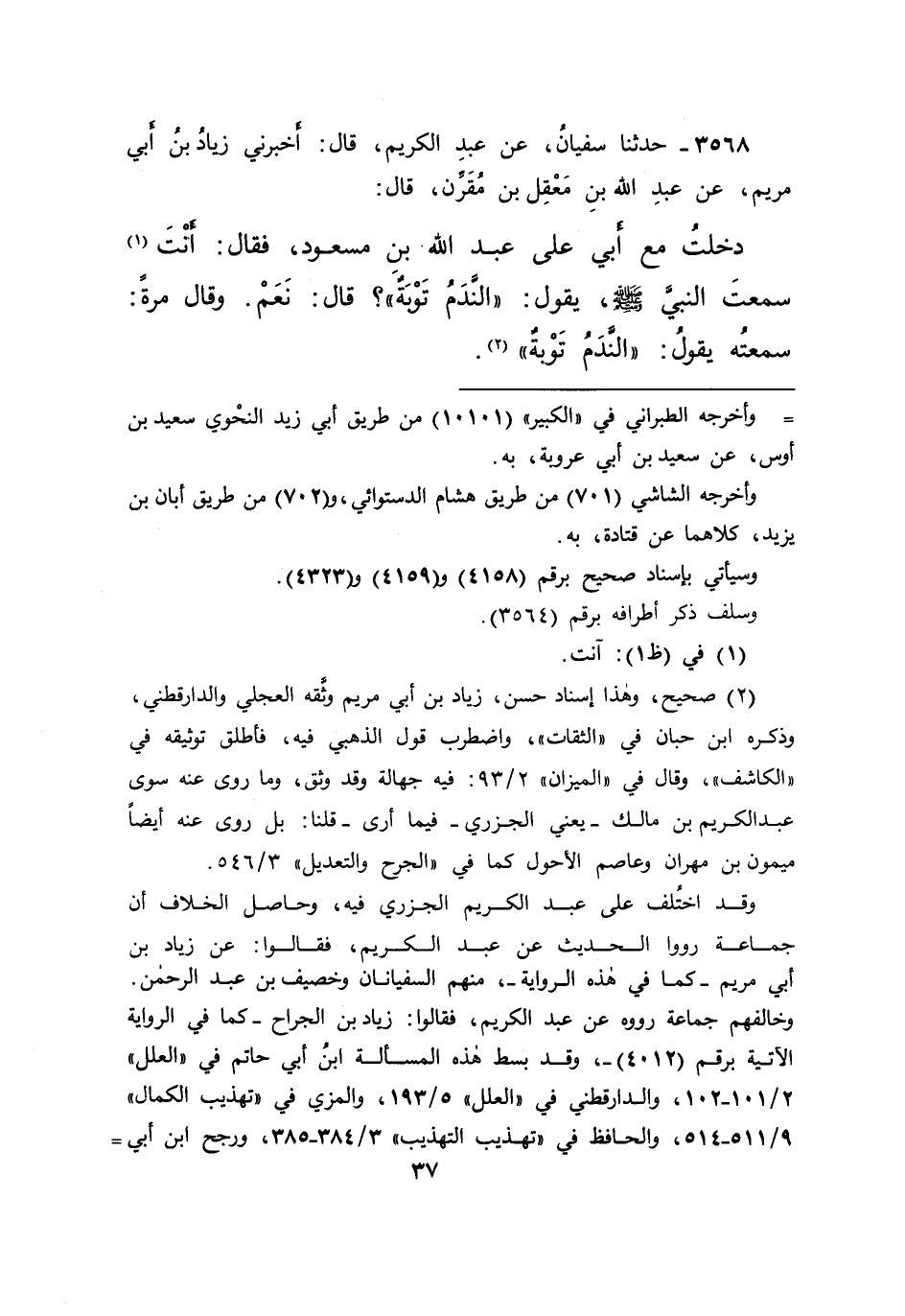 ٣٥٦٨ - حَدَّثَنَا سُفْيَانُ، عَنْ عَبْدِ الْكَرِيمِ، قَالَ: أَخْبَرَنِي زِيَادُ بْنُ أَبِي مَرْيَمَ، عَنْ عَبْدِ اللهِ بْنِ مَعْقِلِ بْنِ مُقَرِّنٍ، قَالَ: دَخَلْتُ مَعَ أَبِي عَلَى عَبْدِ اللهِ بْنِ مَسْعُودٍ، فَقَالَ: أَنْتَ (١) سَمِعْتَ النَّبِيَّ صَلَّى اللهُ عَلَيْهِ وَسَلَّمَ يَقُولُ: " النَّدَمُ تَوْبَةٌ؟ " قَالَ: نَعَمْ، وَقَالَ: مَرَّةً سَمِعْتُهُ يَقُولُ: " النَّدَمُ تَوْبَةٌ " (٢)