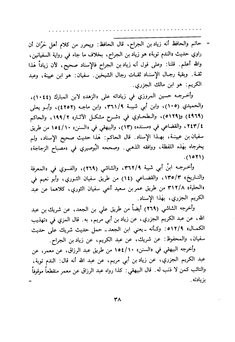 = حاتم والحافظ أنه زياد بن الجراح، قال الحافظ: ويحرر من كلام أهل حَران أن راوي حديث "الندم توبة" هو زياد بن الجراح، بخلاف ما جاء في رواية السفيانين، والله أعلم. قلنا: وعلى قول أنه زياد بن الجراح فالإسناد صحيح، لأن زياداً هذا ثقة. وبقية رجال الإسناد ثقات رجال الشيخين. سفيان: هو ابن عيينة، وعبد الكريم: هو ابن مالك الجزري.