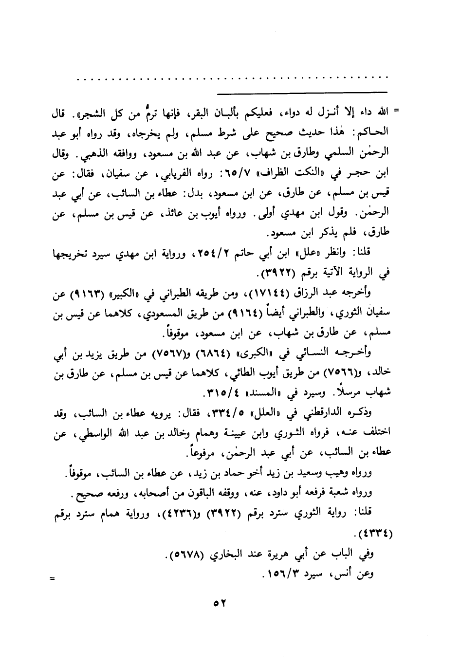 = الله داء إلا أنزل له دواء، فعليكم بألبان البقر، فإنها ترم من كل الشجر". قال الحاكم: هذا حديث صحيح على شرط مسلم، ولم يخرجاه، وقد رواه أبو عبد الرحمن السلمي وطارق بن شهاب، عن عبد الله بن مسعود، ووافقه الذهبي. وقال ابن حجر في "النكت الظراف" ٧/٦٥: رواه الفريابي، عن سفيان، فقال: عن قيس بن مسلم، عن طارق، عن ابن مسعود، بدل: عطاء بن السائب، عن أبي عبد